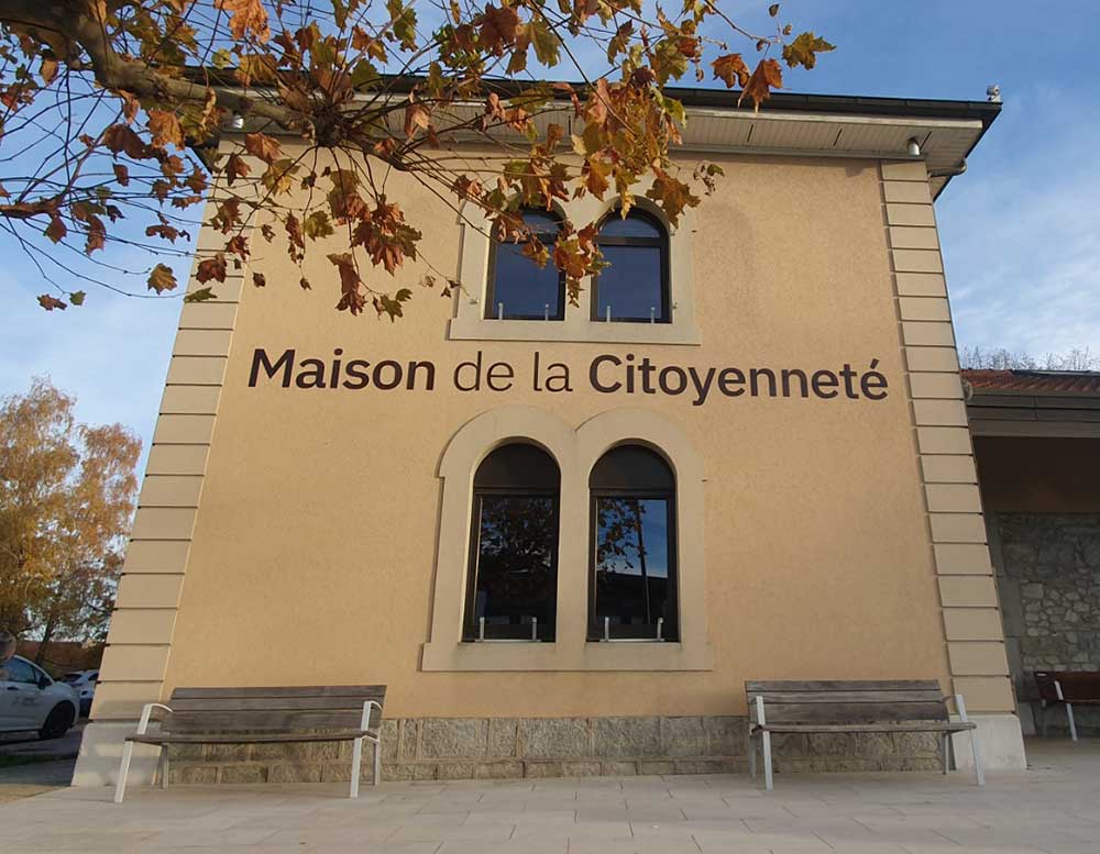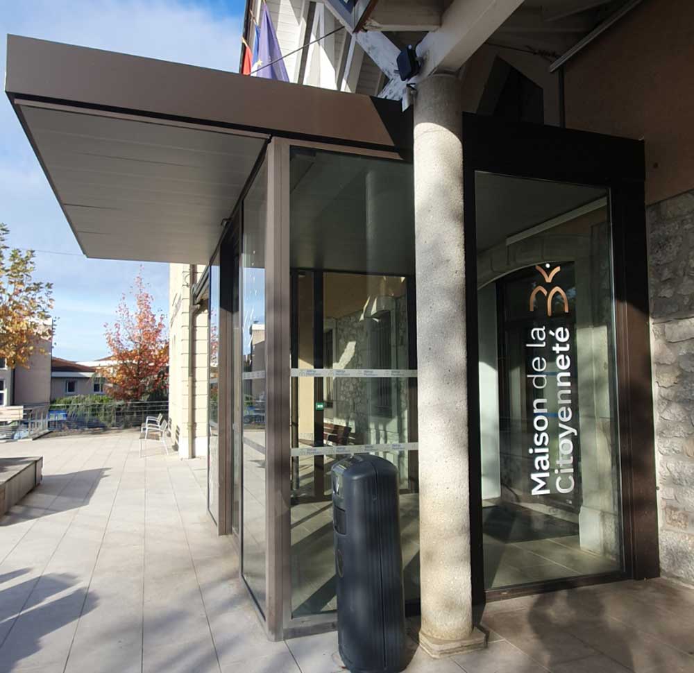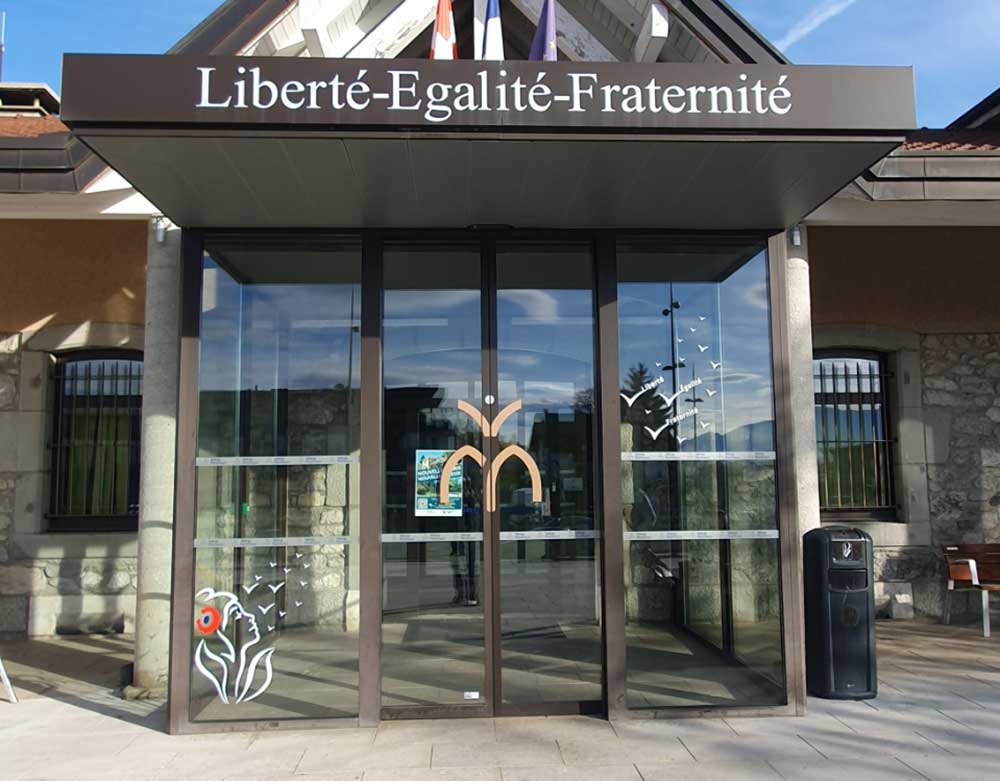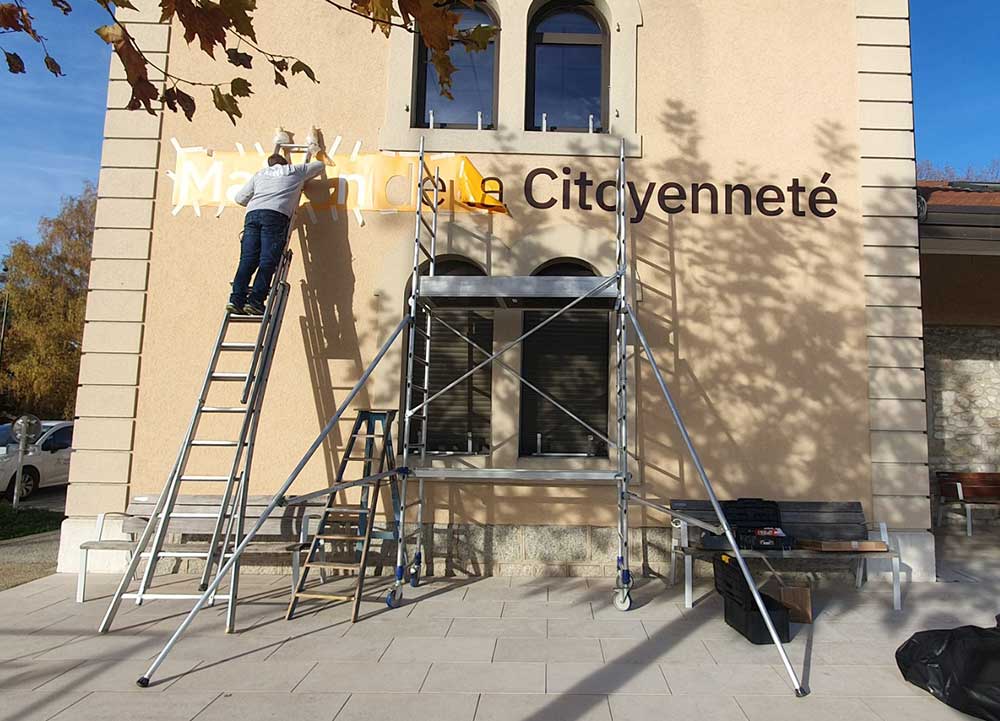 Création d’une enseigne en lettres Alu Dibond et marquage des vitrines de l’ancienne mairie de Vétraz-Monthoux, désormais transformée en Maison de la Citoyenneté. Création graphique réalisée par nos soins.