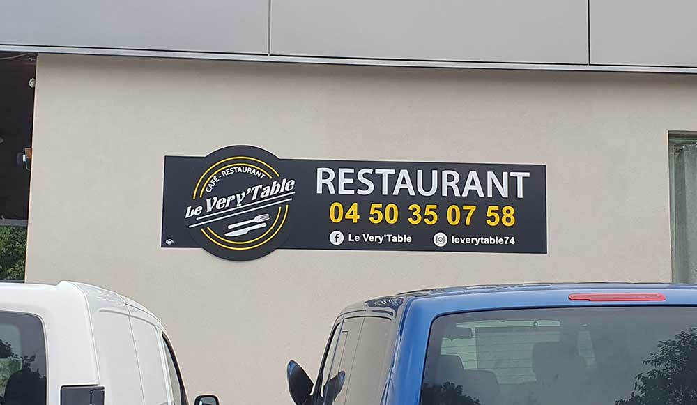 Création & Installation d’une enseigne avec superposition de panneaux Alu dibond. Décor réalisé par nos soins.