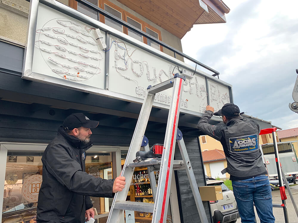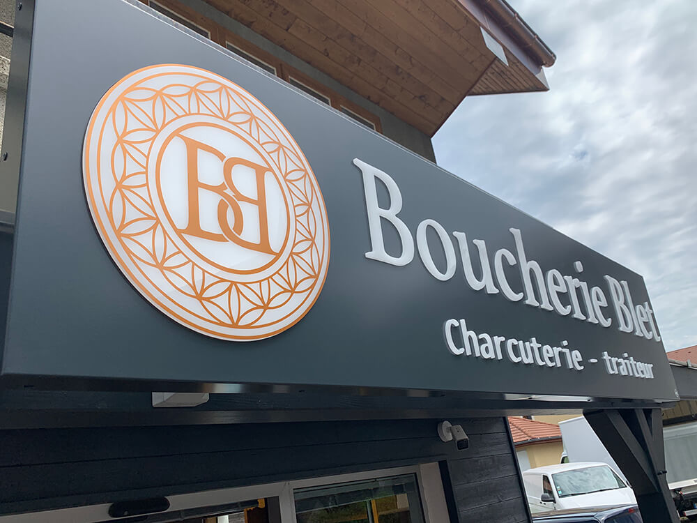 Création d’une enseigne avec caisson lumineux & lettrages Plexi en relief pour cette boucherie installée sur la commune de Boëge. Création graphique réalisée par notre partenaire OAK-Webdesign.