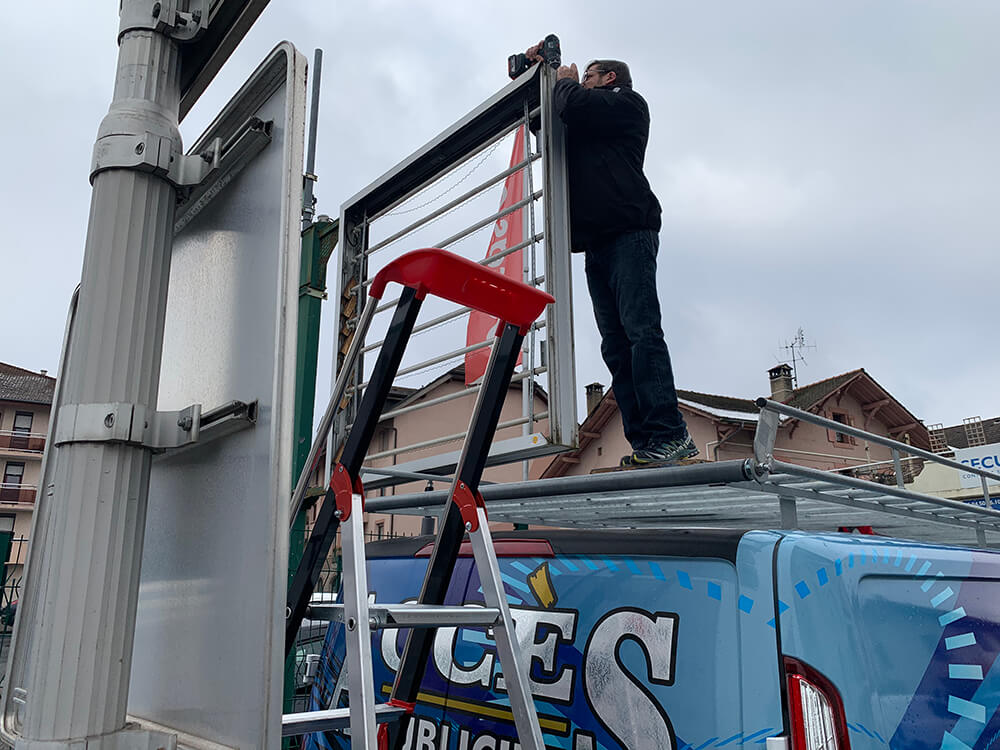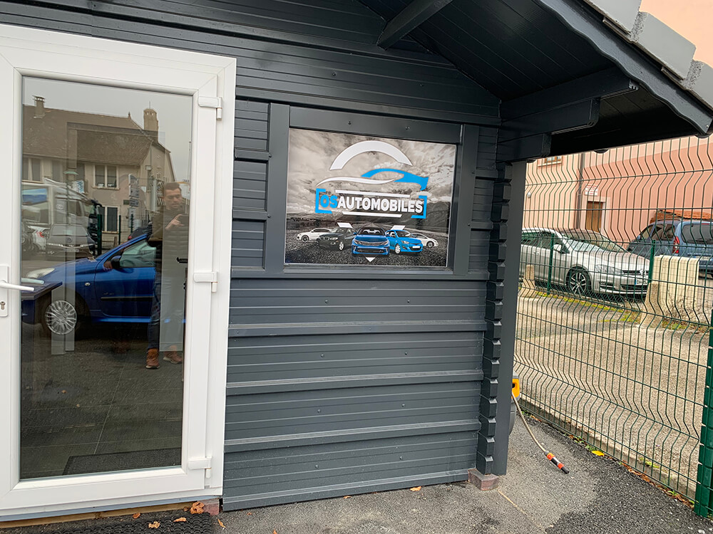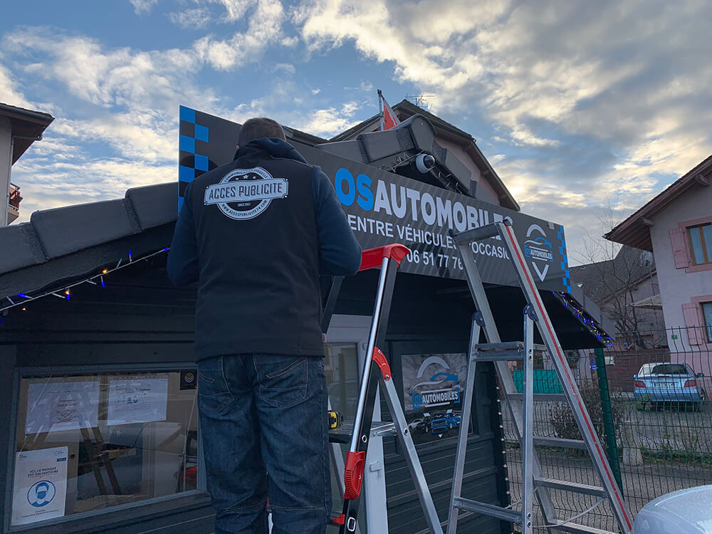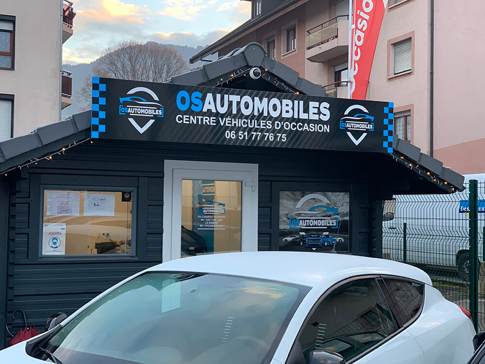 Remplacement du caisson lumineux et mise en place d’éléments décoratifs sur un parc de véhicules d’occasion installé à Bons-en-Chablais. Création graphique réalisée par notre partenaire OAK-Webdesign.