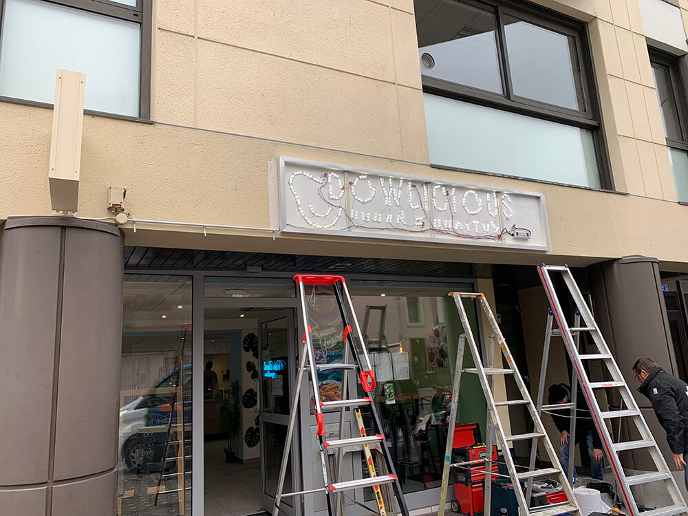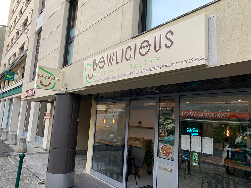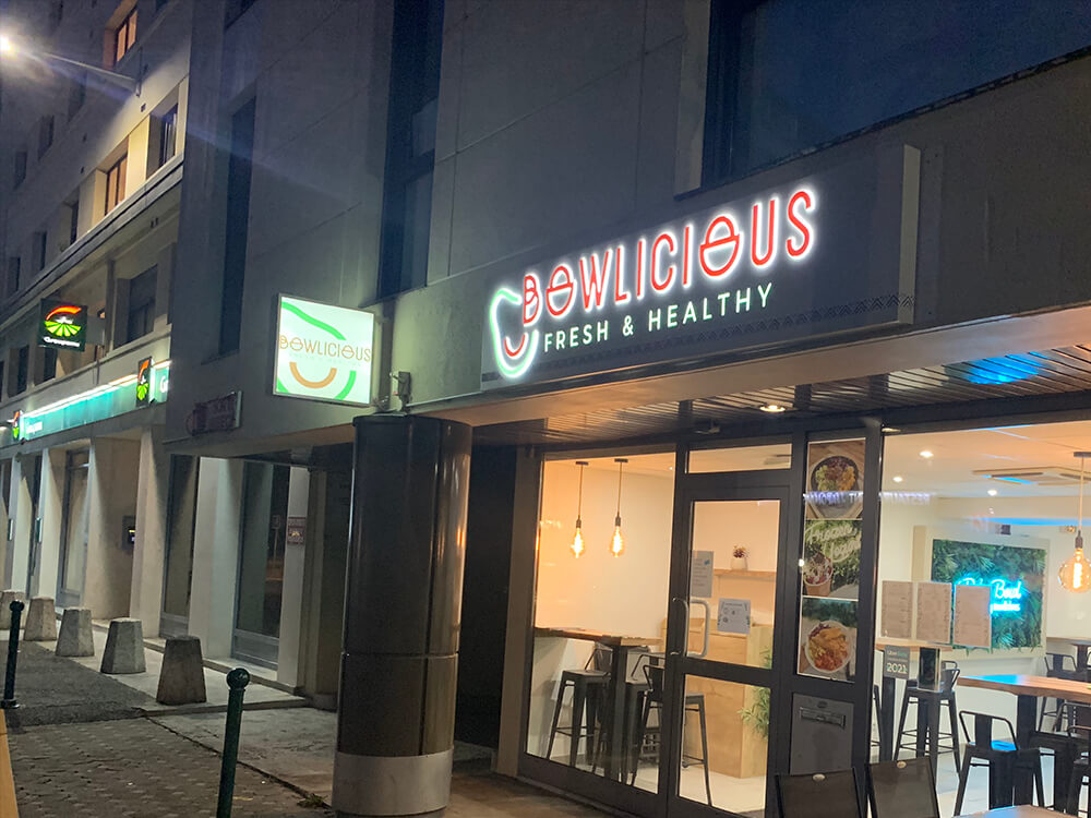 Création d’une enseigne drapeau et d’une enseigne avec caisson lumineux & lettrages Plexi en relief pour ce restaurant asiatique spécialisé dans la confection de Poke Bowl et de Frozen Yogurt. Créations graphiques réalisées par notre partenaire OAK-Webdesign.