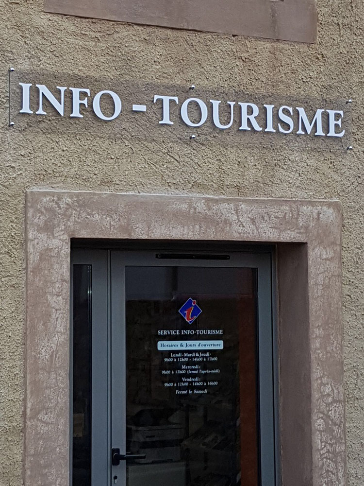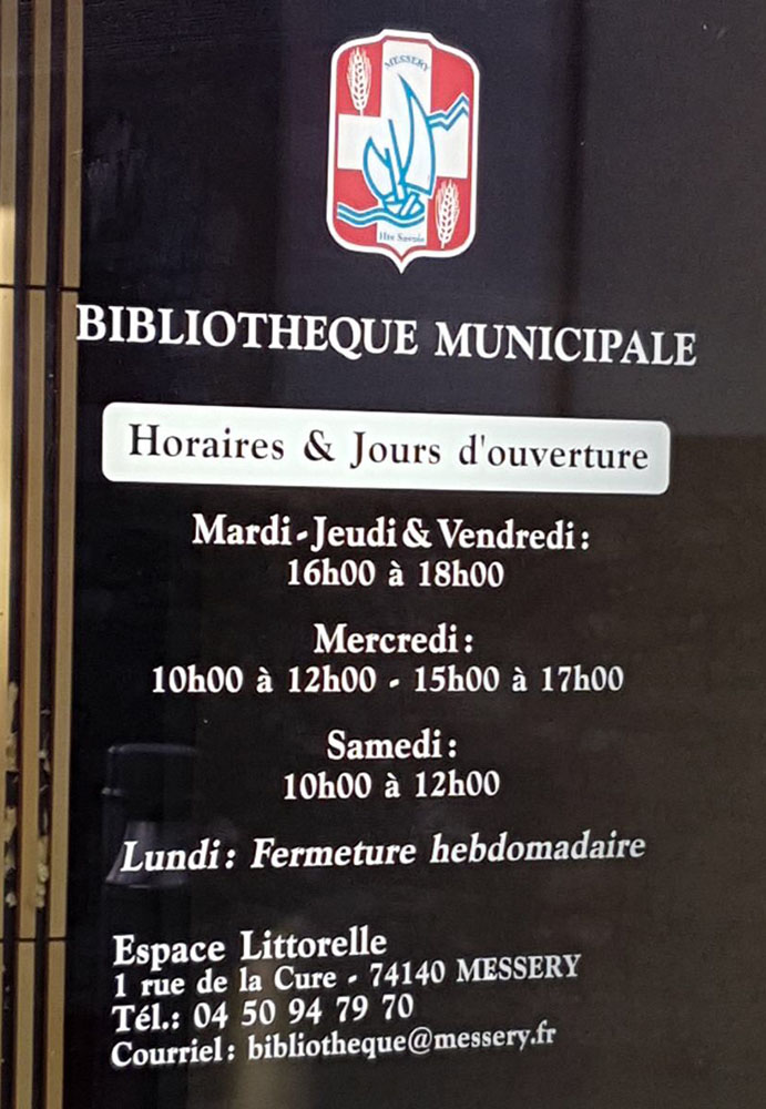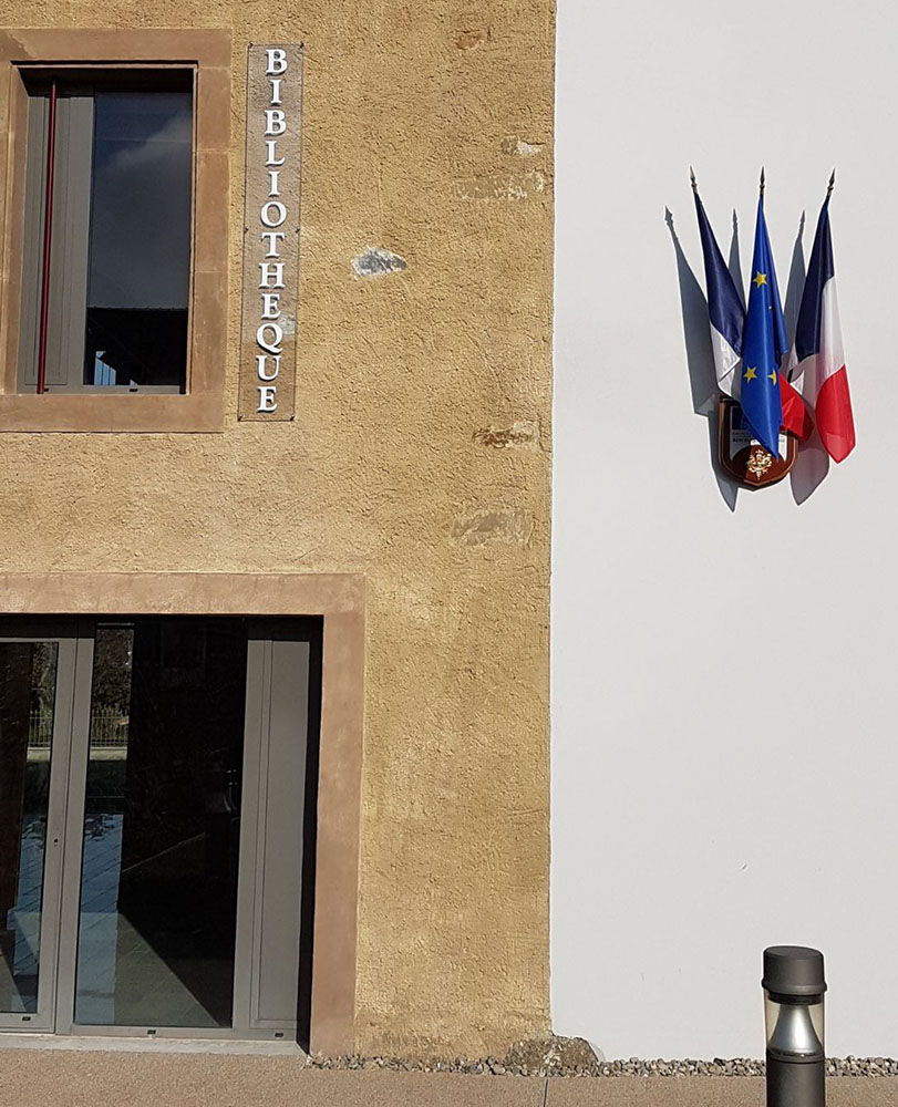 Réalisation d’enseignes en pléxi avec décor en film vynil haute résistance afin d’identifier ce bâtiment communal. Un décor adhésif a également été réaliser sur la porte afin de faire apparaître les informations générales de cette bibliothèque. Décors réalisés par nos soins
