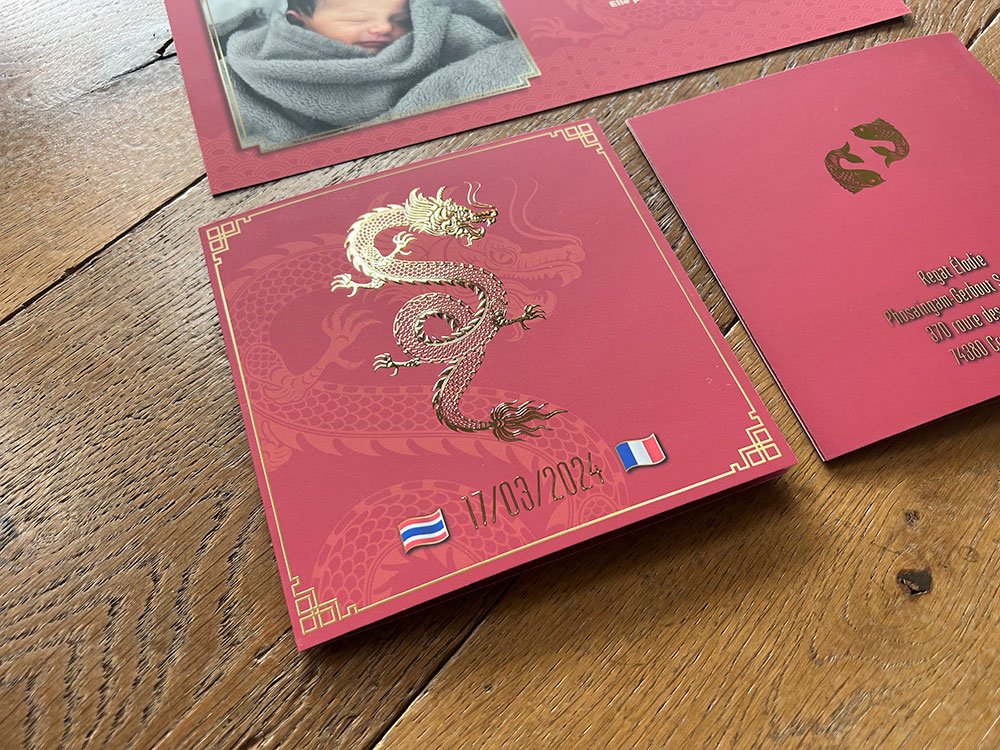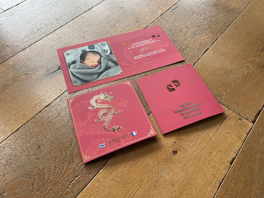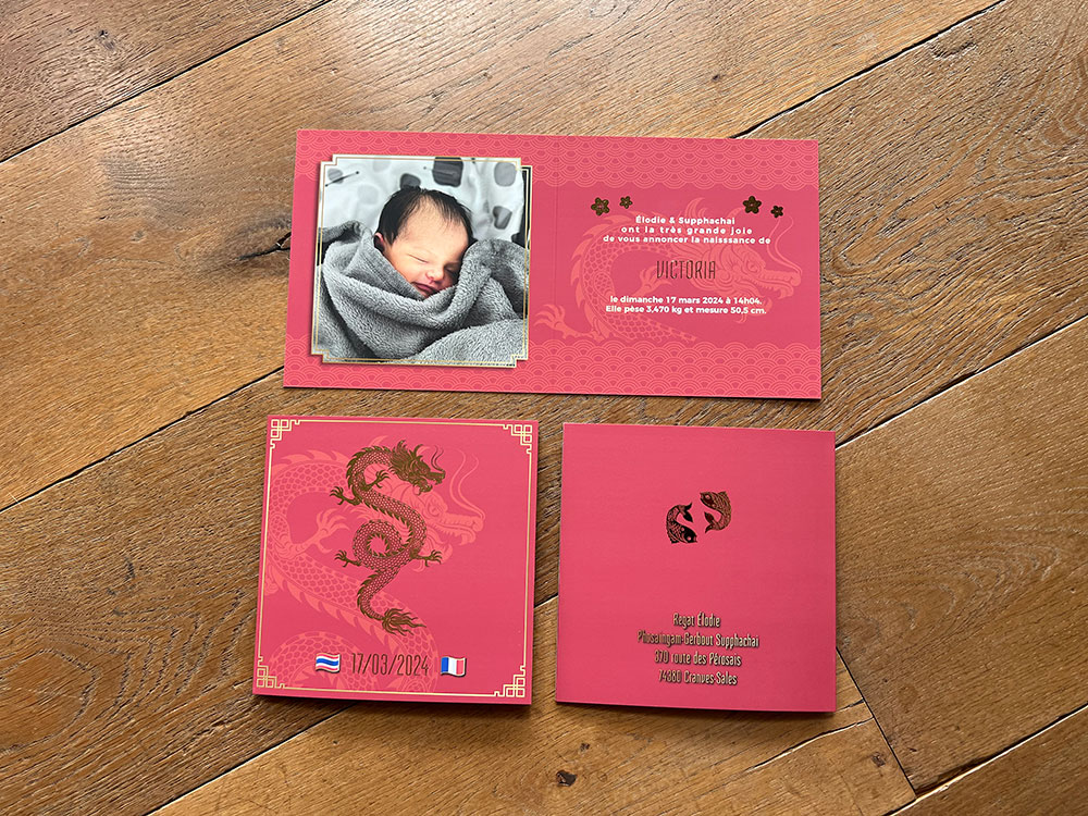 Impression de faire-parts de naissance avec finition dorure à chaud pour un particulier. Création graphique réalisée par notre partenaire OAK-Webdesign.
