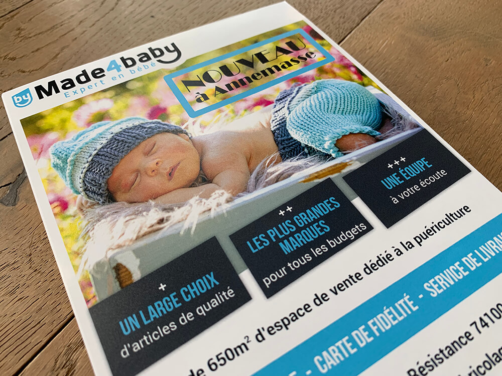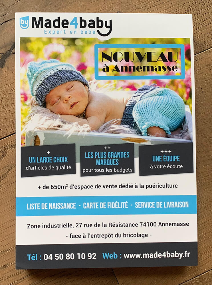 Création de flyers permettant la promotion du nouveau magasin de puériculture installé à Annemasse. Supports de communication imprimés par nos soins.