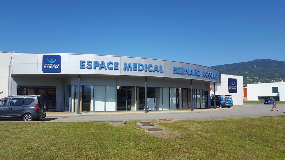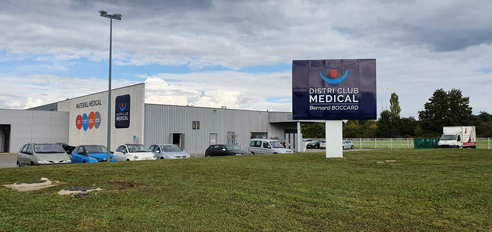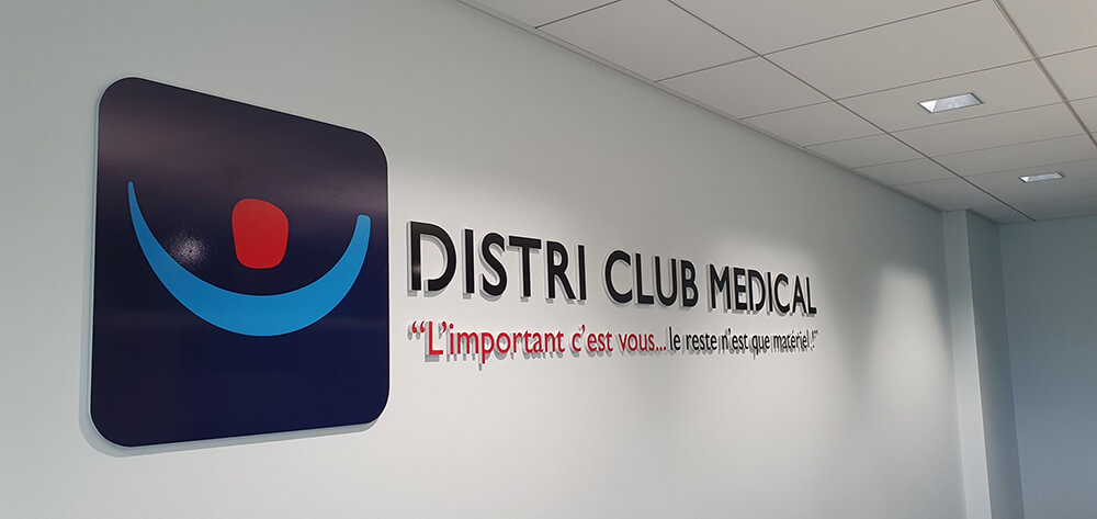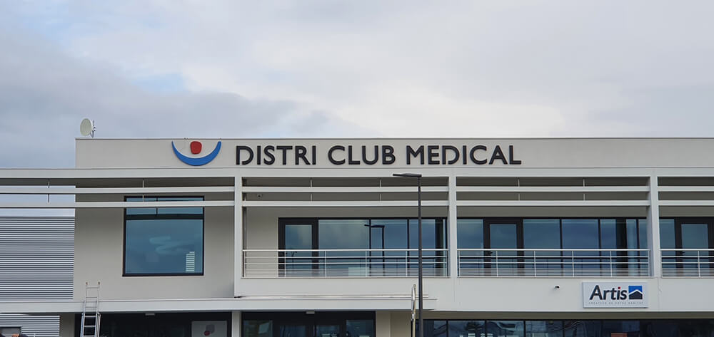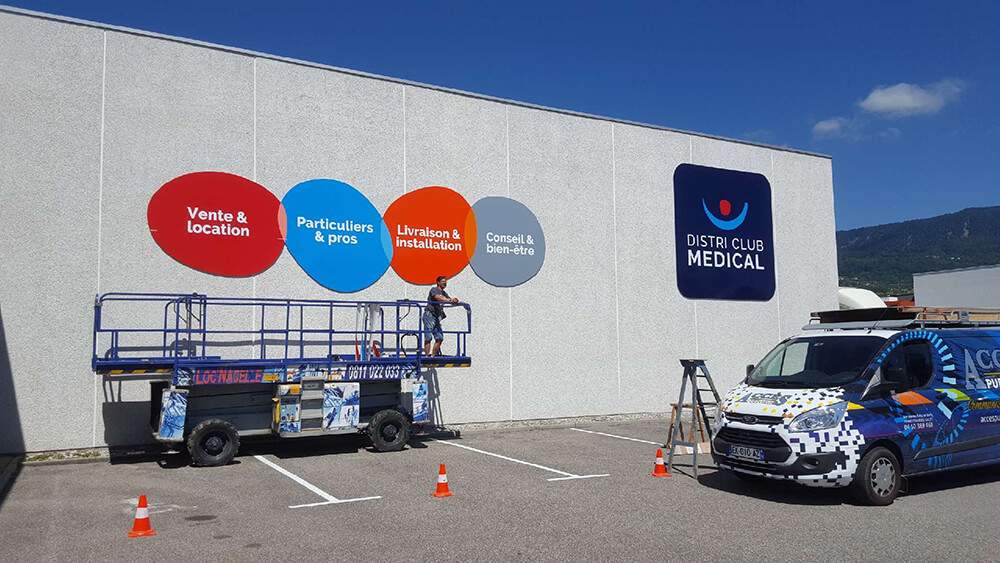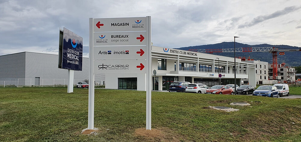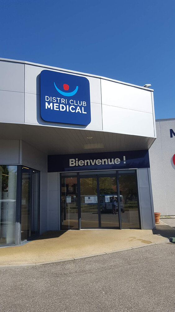 Fourniture & Installation d’une signalétique extérieure complète permettant d’identifier les locaux de l’entreprise Distri Club Médical installée à Cranves-Sales. Décor fourni par le client conformément à sa nouvelle charte graphique.