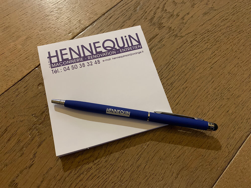 Création & impression de bloc-notes et stylos personnalisés pour une entreprise de maçonnerie installée à Annemasse qui souhaitait gâter ses clients.