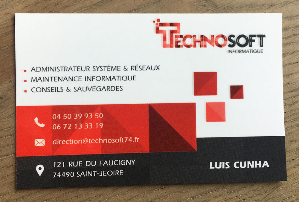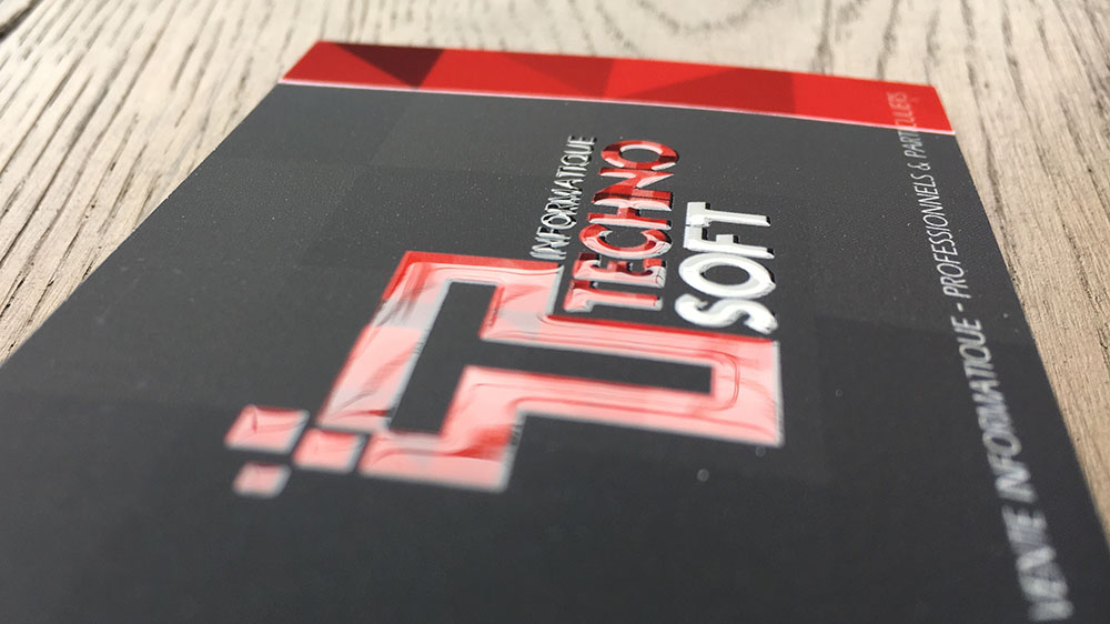 Création d’une identité visuelle pour ce spécialiste de l’informatique. La carte de visite a une finition en vernis sélectif 3D pour un maximum d’impact.