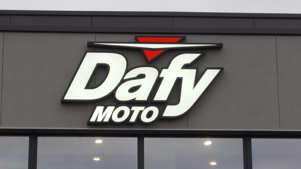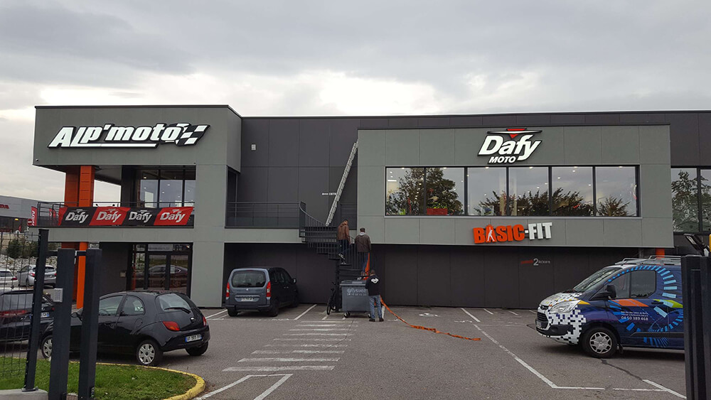 Création & installation de l’enseigne lumineuse avec mise en relief du logo de ce concessionnaire moto qui vient de déménager dans ses nouveaux locaux. Nous avons également installé les différentes enseignes fournis par les marques.