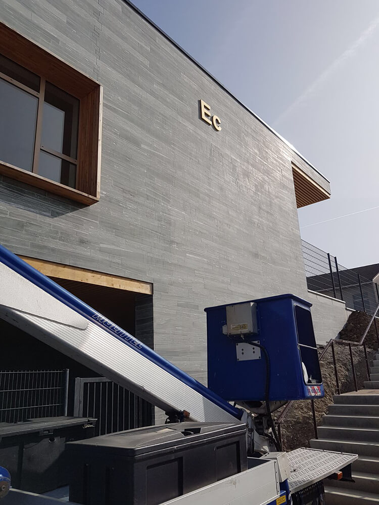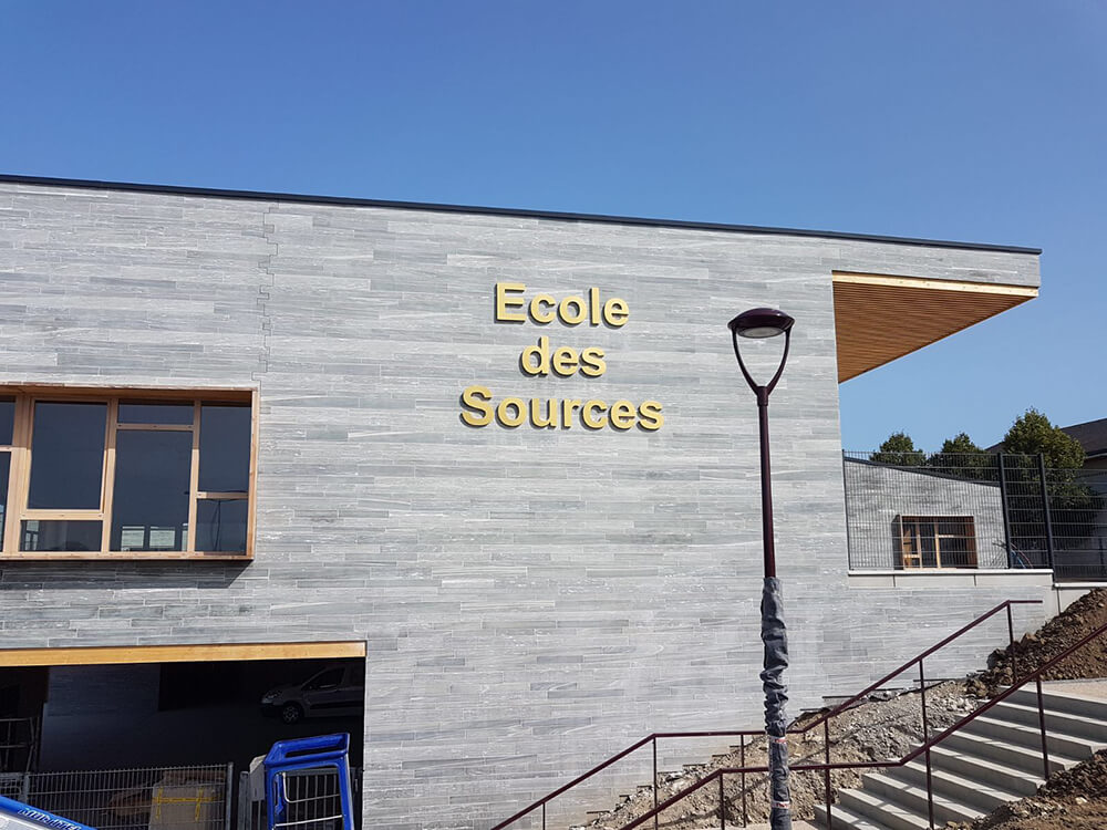 Création d’une enseigne en lettres reliefs Alu laqué or brillant pour cette nouvelle école de Cranves-Sales. Décor réalisé par nos soins.