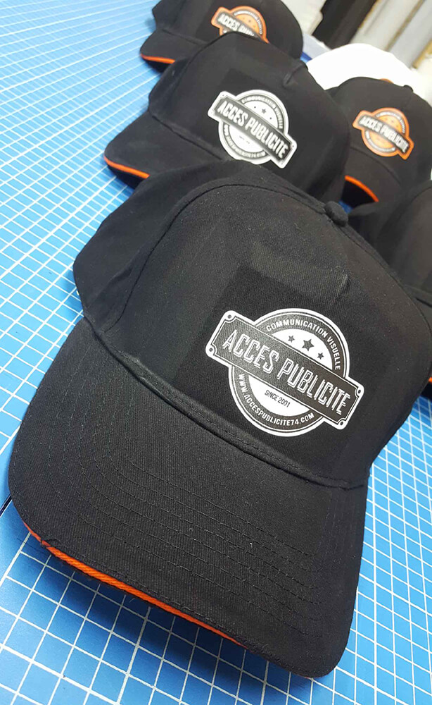 Marquage de casquettes destinées à notre clientèle. Décor réalisé par nos soins.