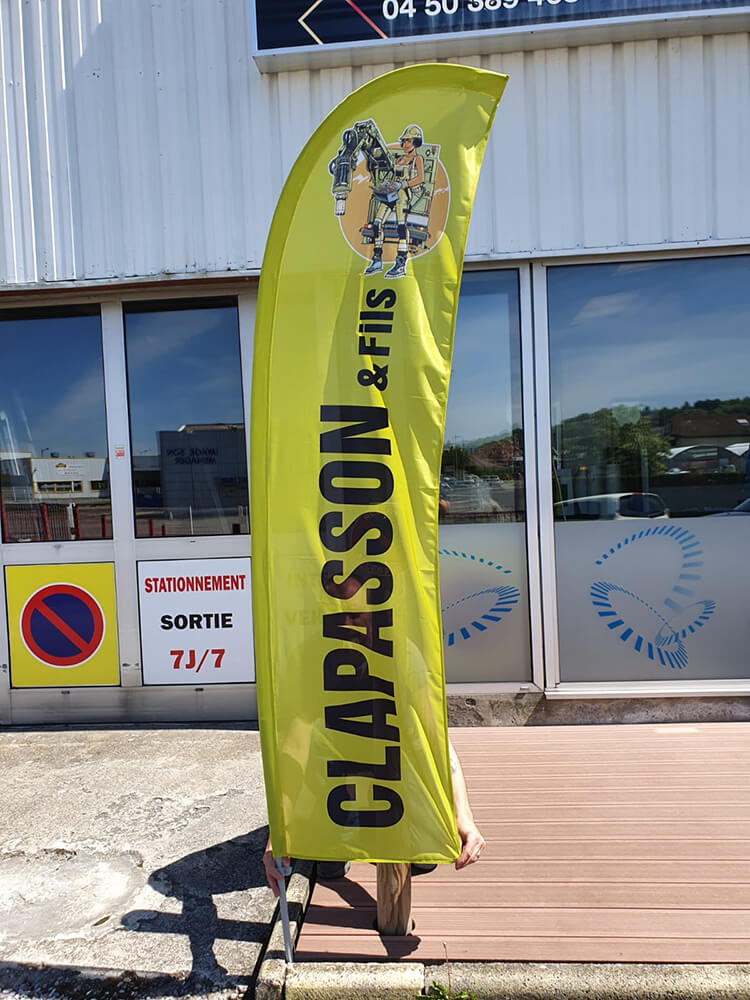 Réalisation de drapeaux personnalisés appelés « Oriflamme » pour l’entreprise Clapasson spécialisées dans les travaux de terrassement sur le secteur Genevois. Toutes nos flammes sont assemblées et imprimées sur place.