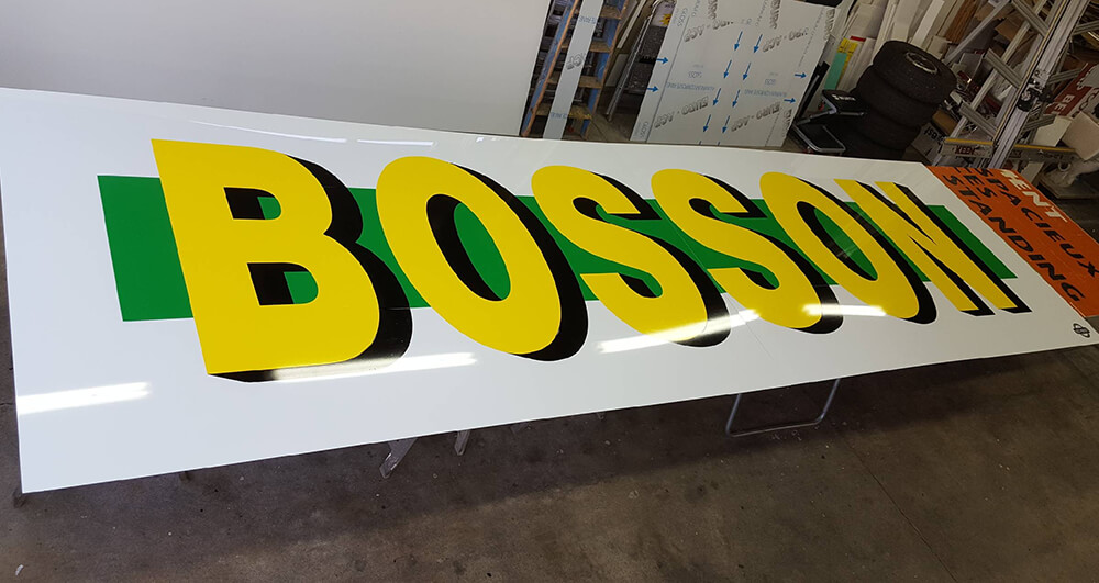 Création d’un panneau Alu Dibond avec décor adhésif teinté masse pour l’entreprise Bosson située à Cranves-Sales. Décor réalisé par nos soins.