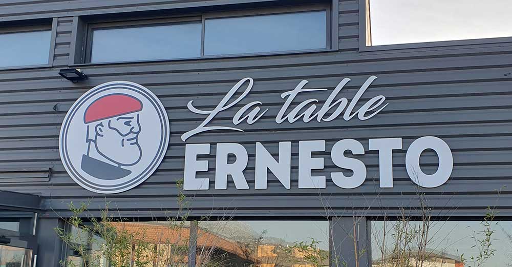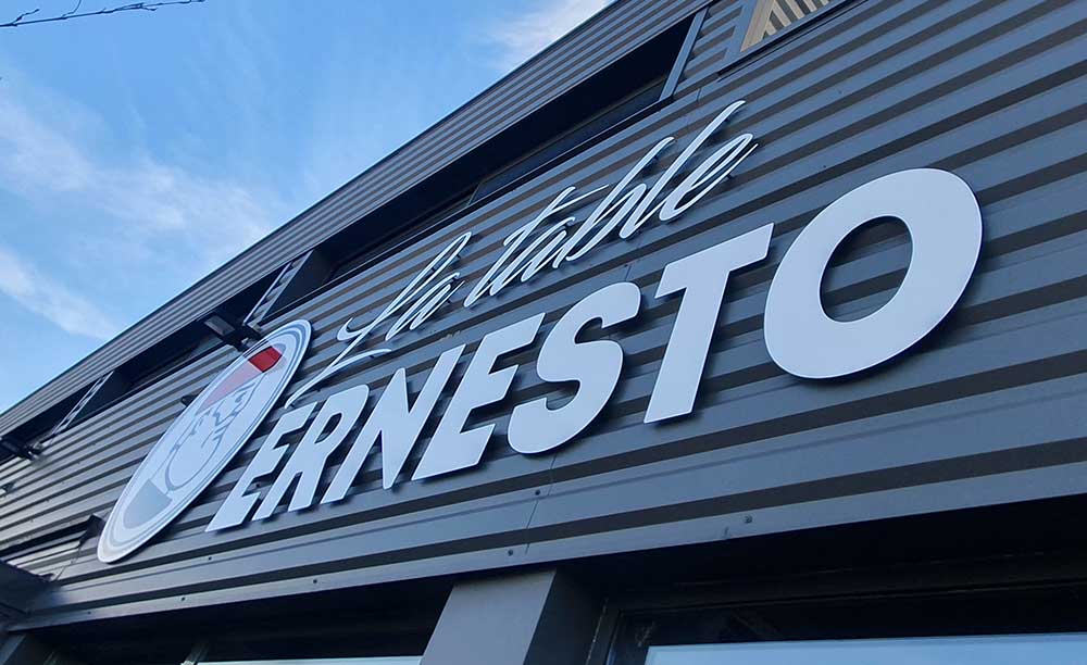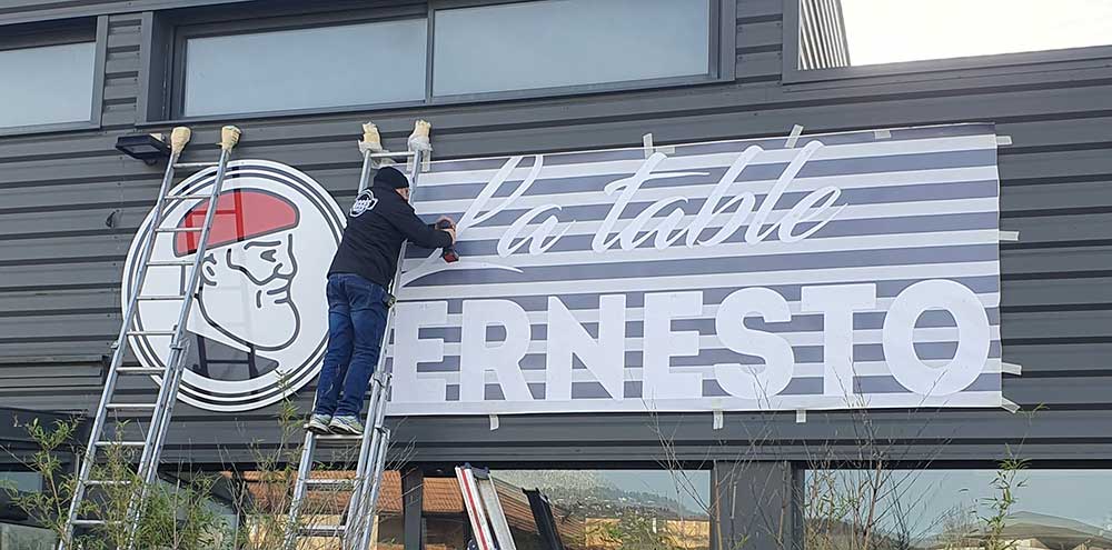 Création & Installation d’une enseigne en panneau Alu dibond et de lettres découpées pour ce nouveau restaurant qui ouvre ses portes à Cranves-Sales. Décor réalisé par nos soins.