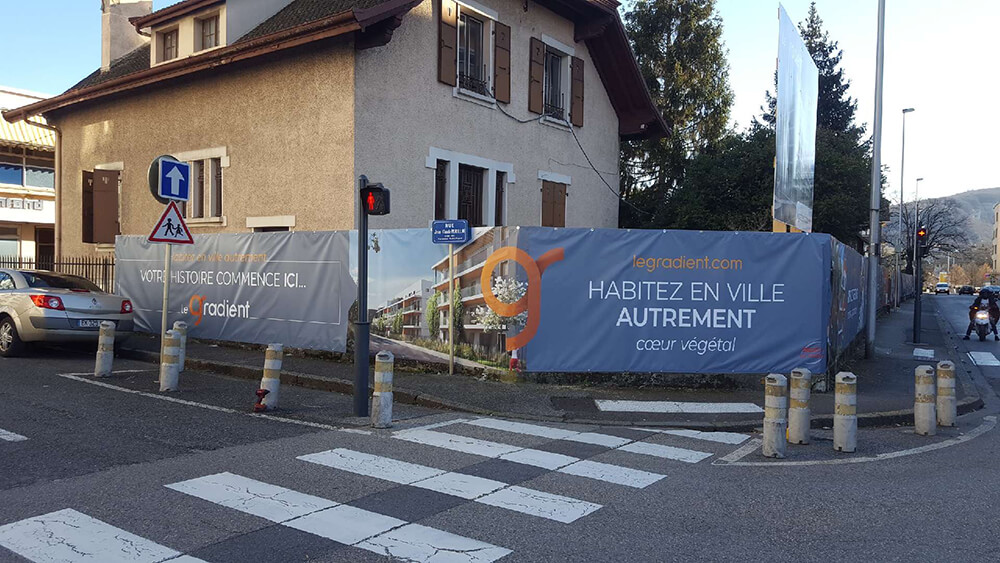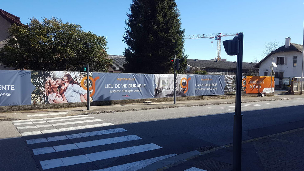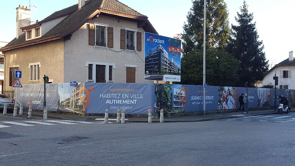 Installation d’un panneau forex 4X3 avec décor adhésif et de banderoles en impression numérique afin de faire la promotion de ce nouveau programme immobilier sur Annemasse. Décor fourni par le client.