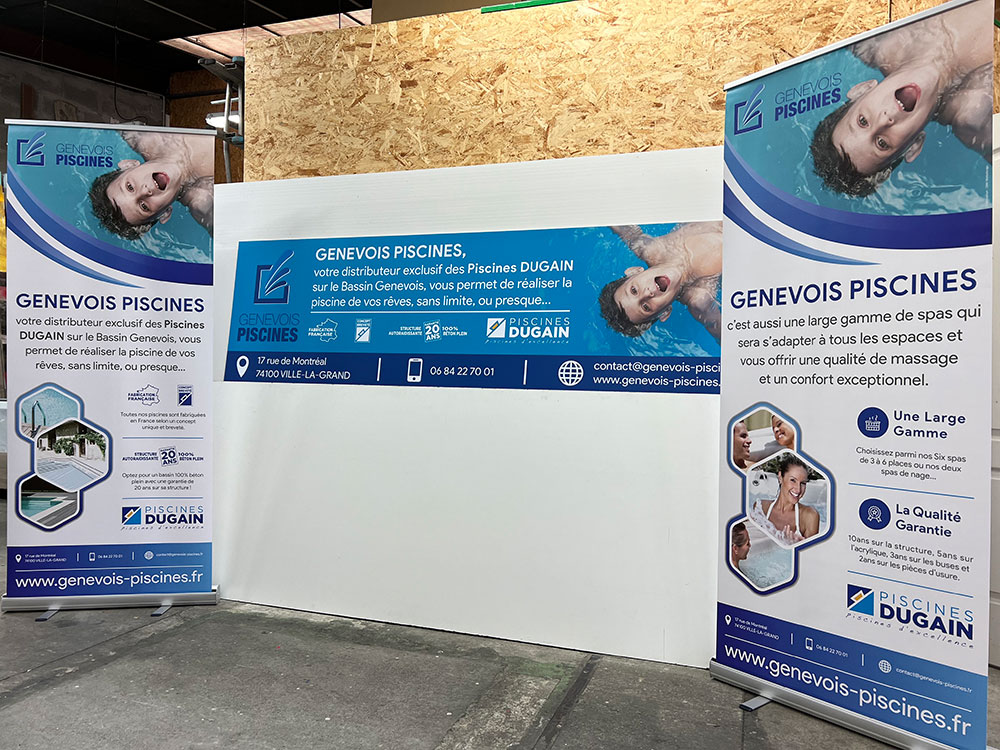 Réalisation d’un panneau PVC avec impression numérique et de 2 Roll’Up permettant de faire la promotion des activités de ce revendeur des piscines Dugain sur le bassin Genevois. Tous nos Roll’Up sont assemblés et imprimés sur place. Décor réalisé par notre partenaire graphique OAK-Webdesign.