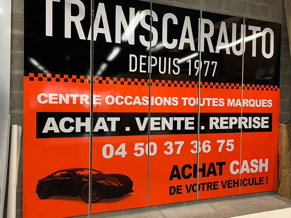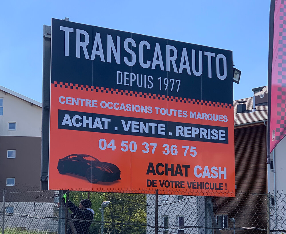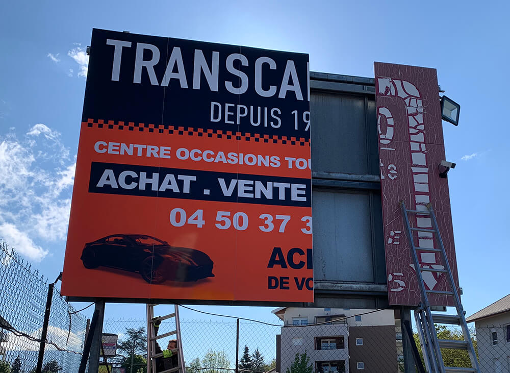 Marquage en décor adhésif d’un panneau d’affichage de 12m2 avec application de la nouvelle charte graphique de ce vendeur automobiles d’Annemasse.Décor réalisé par notre partenaire graphique OAK-Webdesign.