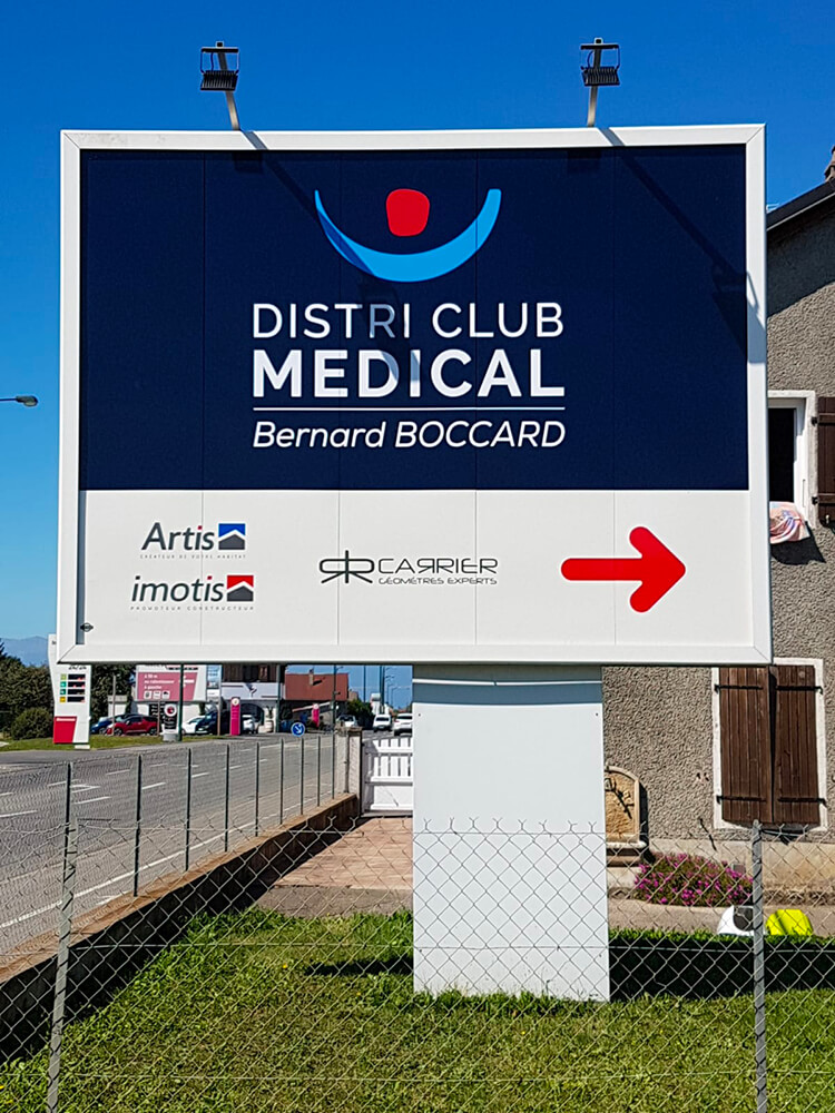 Marquage en décor adhésif d’un panneau d’affichage de 12m2 double face pour cette enseigne spécialisée dans la vente de matériel médical. Décor réalisé par nos soins.