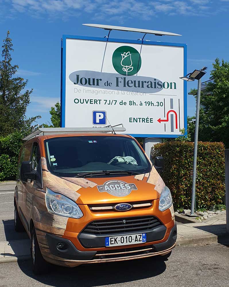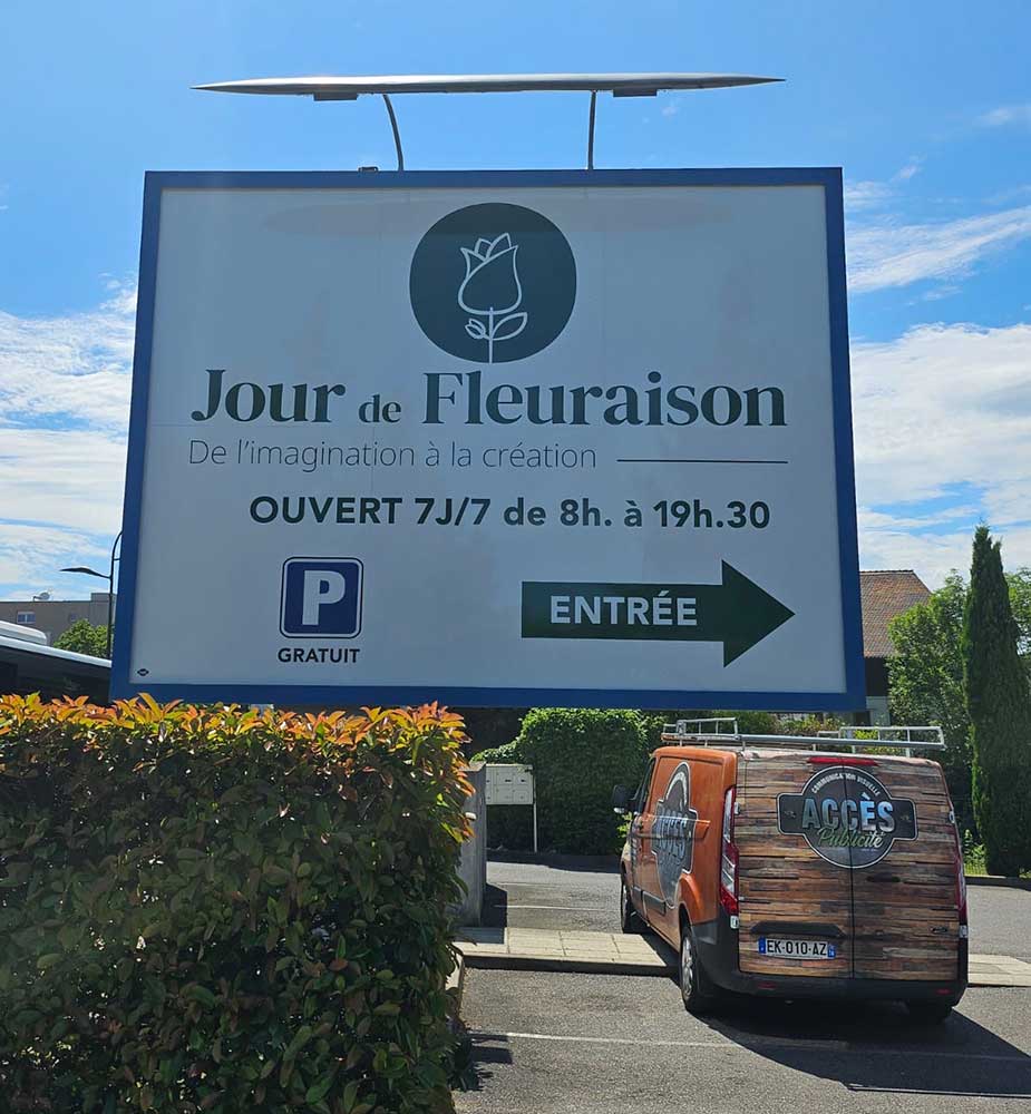Création & Installation d’un panneau d’affichage de 12m2 avec décor adhésif pour le magasin Jour de fleuraison, votre fleuriste basé sur Annemasse et Cranves-Sales. Décor réalisé par nos soins.