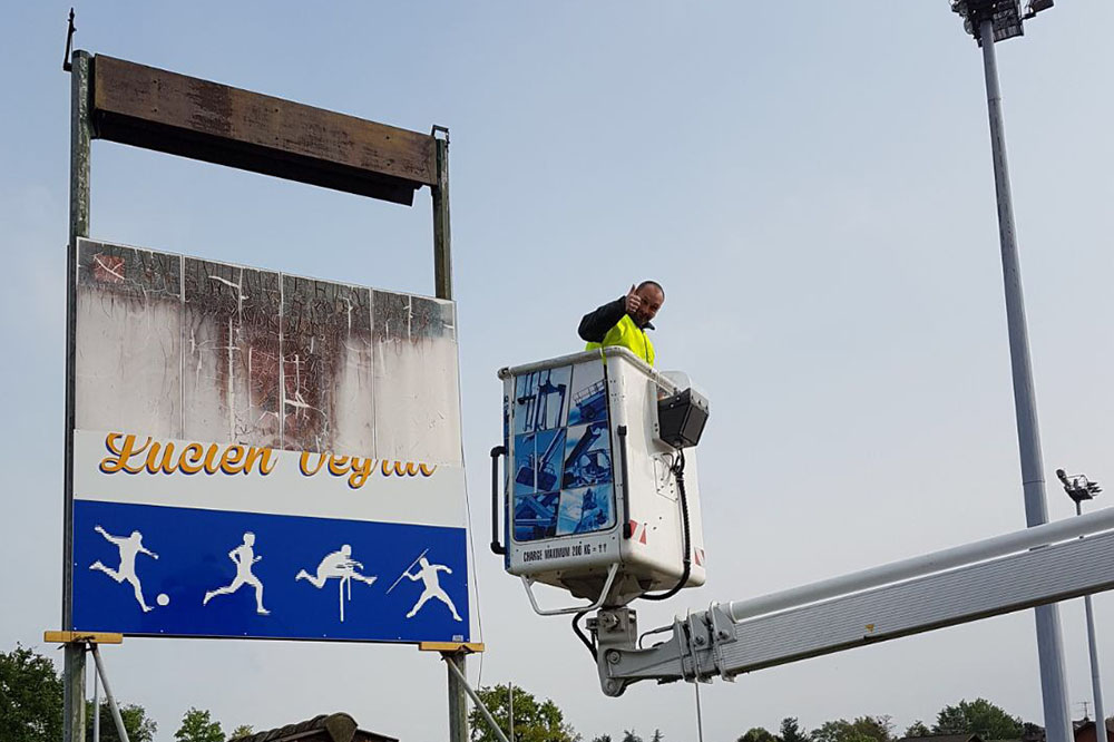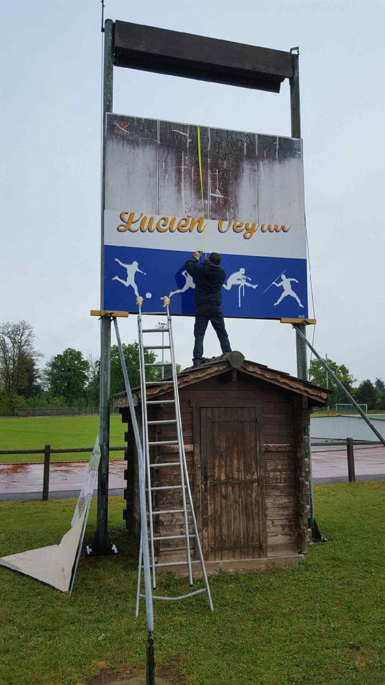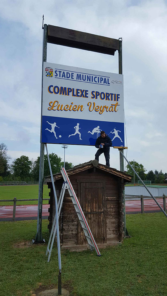 Réalisation et installation d’un panneau d’information permettant d’identifier le stade municipal de la commune d’Ambilly. Décor réalisé par nos soins