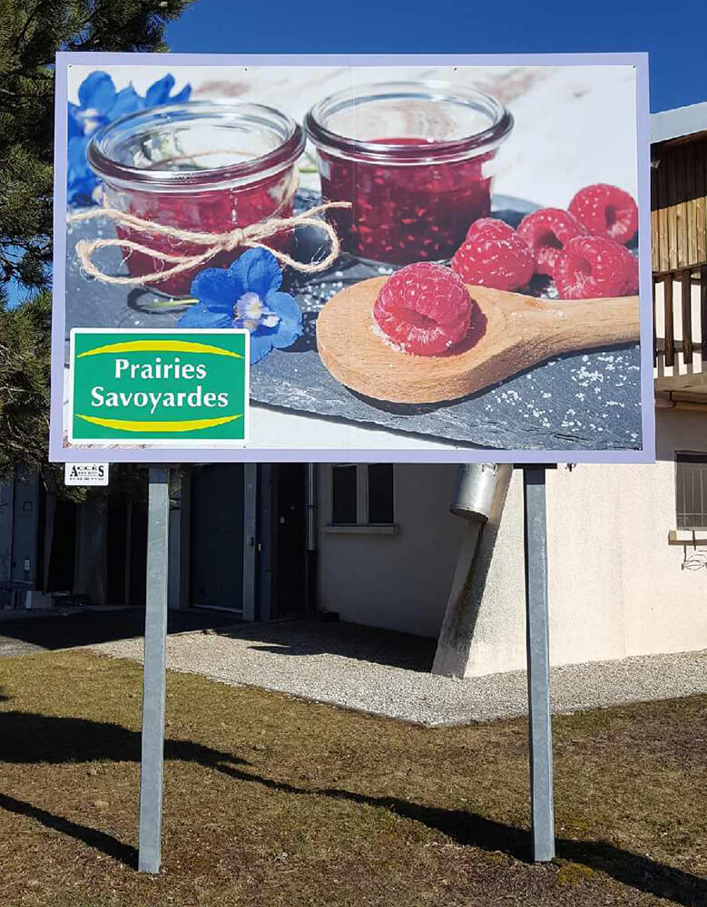 Création & Installation d’un panneau permettant faire la promotion des produits bio commercialisés pour cette laiterie. Décor réalisé par nos soins.