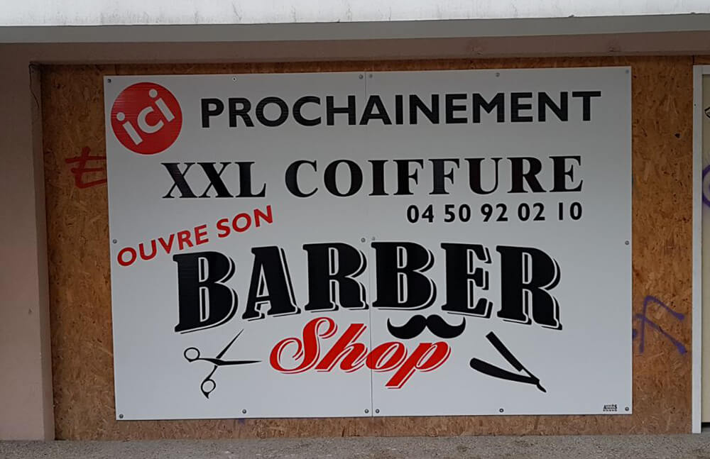 Création & Installation d’un panneau permettant d’annoncer l’ouverture prochaine d’un barber shop à Annemasse. Décor réalisé par nos soins.