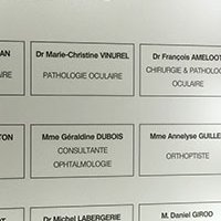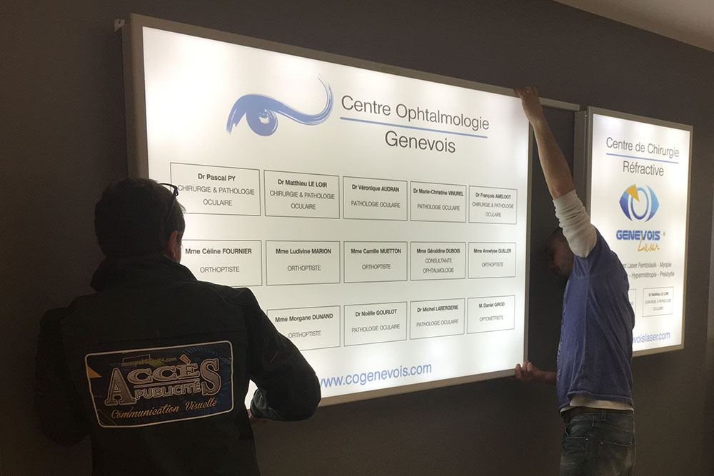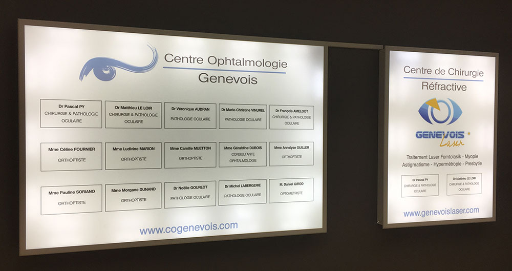 Réalisation de panneaux lumineux à leds permettant d’identifier les médecins présents dans ce cabinet d’ophtalmologie. Ces réalisations se composent de caissons en aluminium, d’une face polymère diffusante et de décors en film vynil haute résistance. Décors réalisés par notre partenaire graphique OAK-Webdesign.
