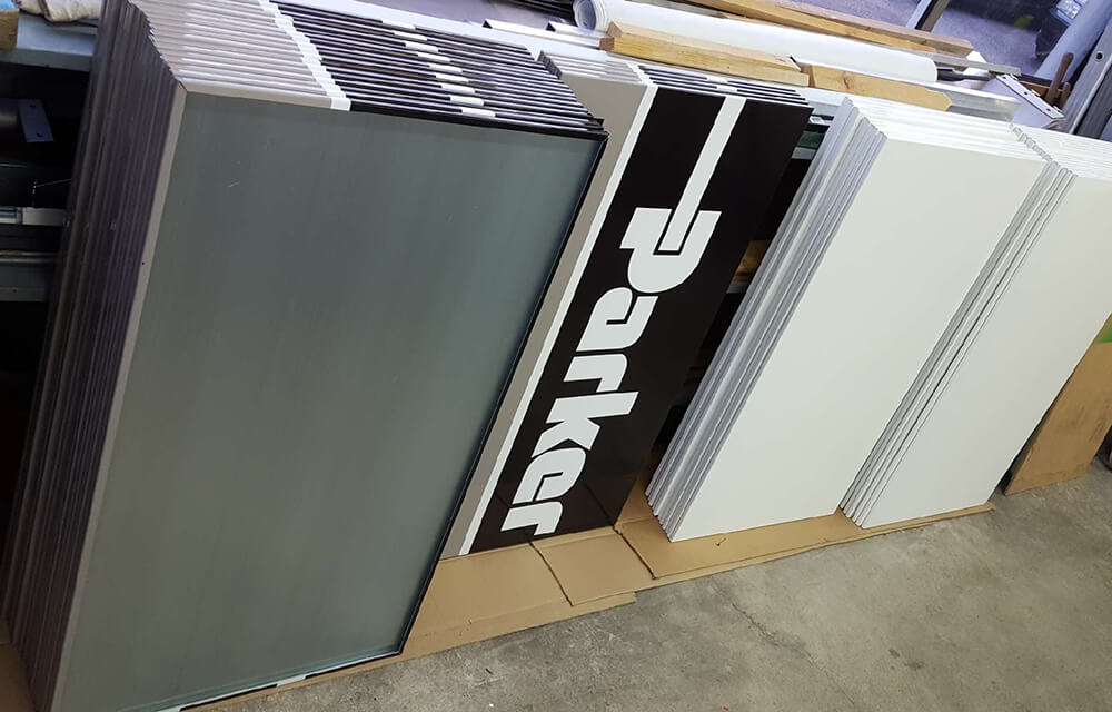 Création de panneaux alu avec décor adhésif destinés aux usines européennes du groupe Parker. Décor fourni par le client.