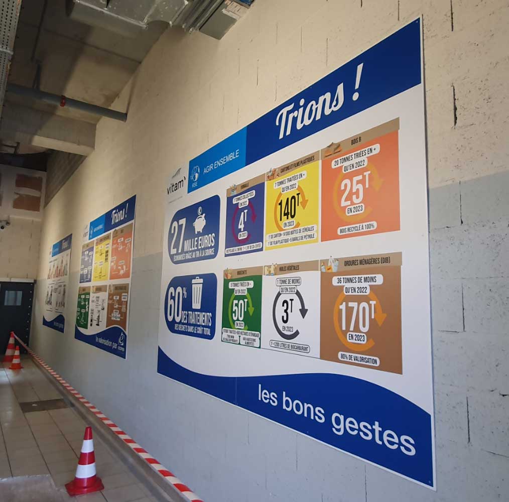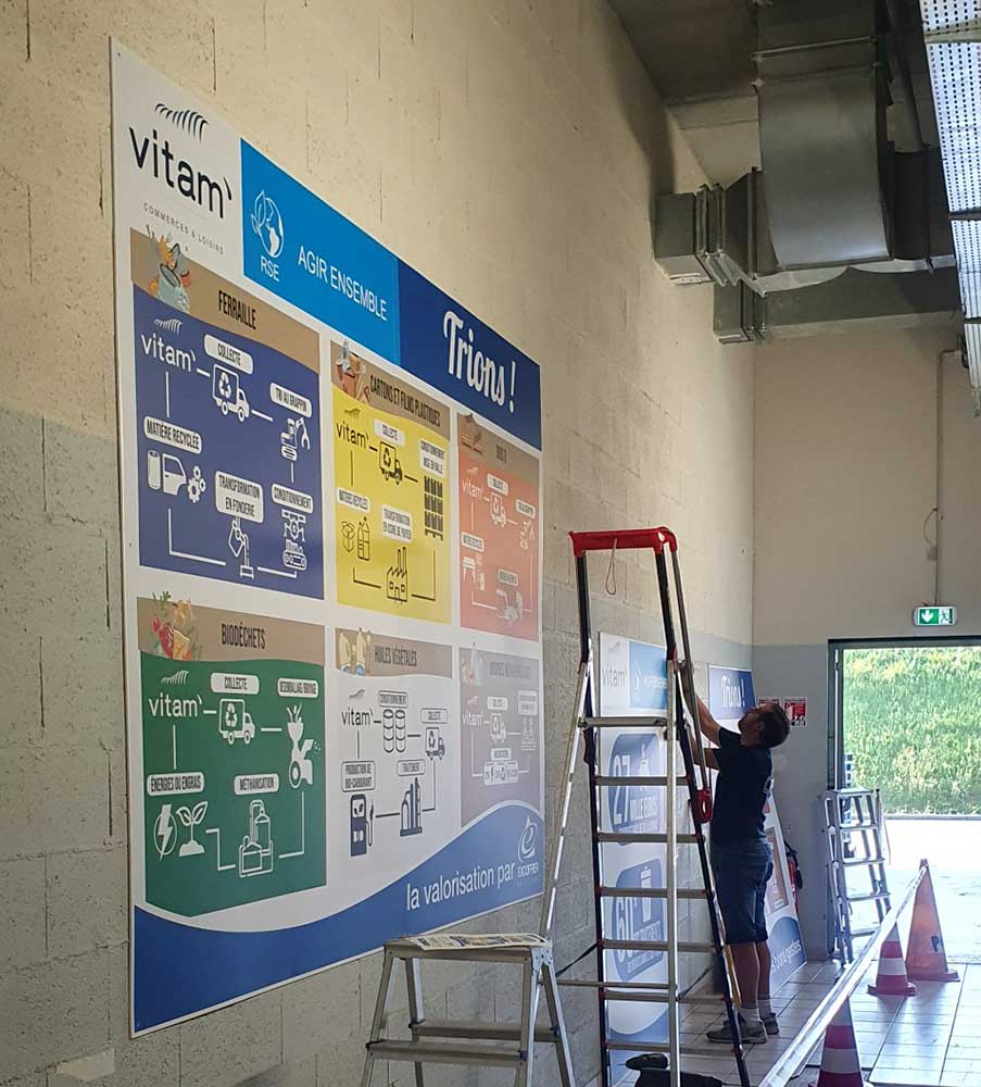 Création & Installation de panneaux d’affichage avec décor adhésif pour le magasin Migros de Neydens. Décor fourni par le client.