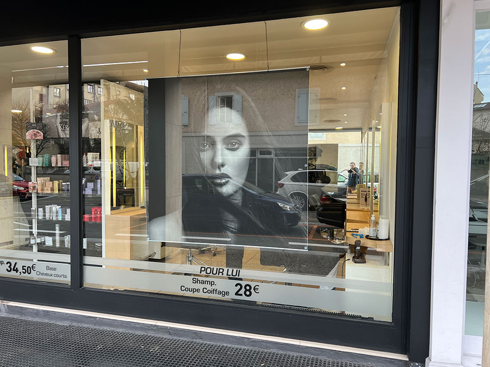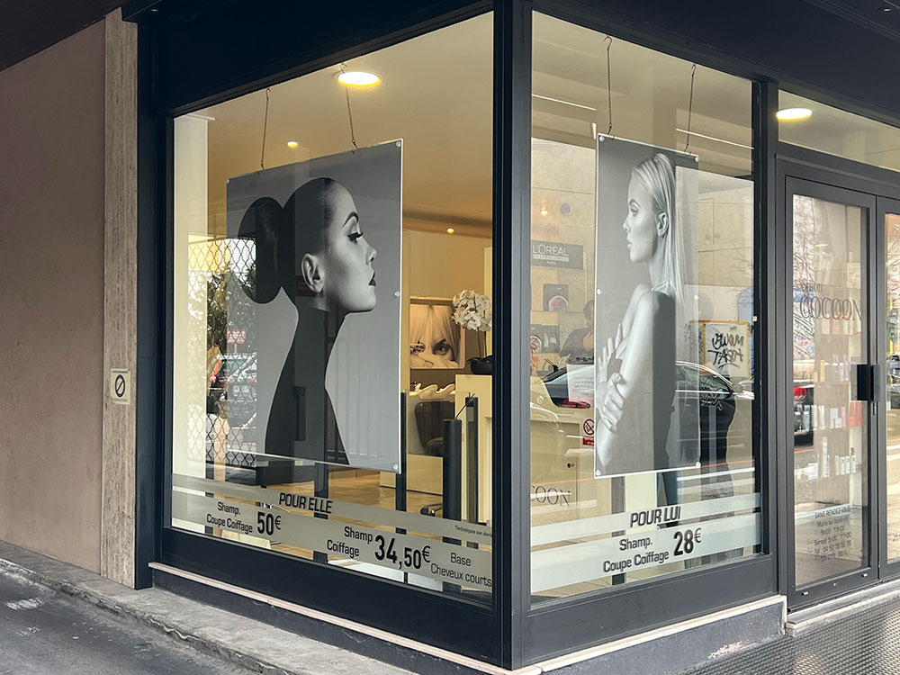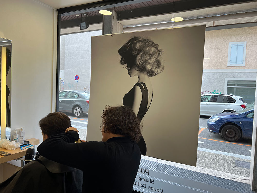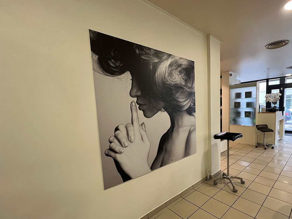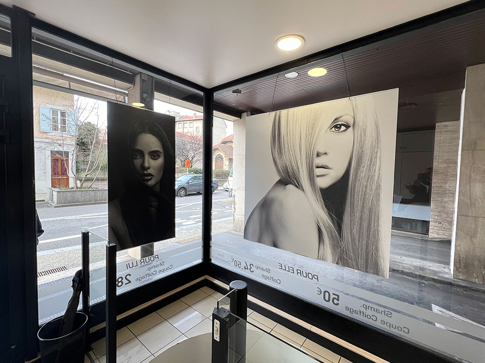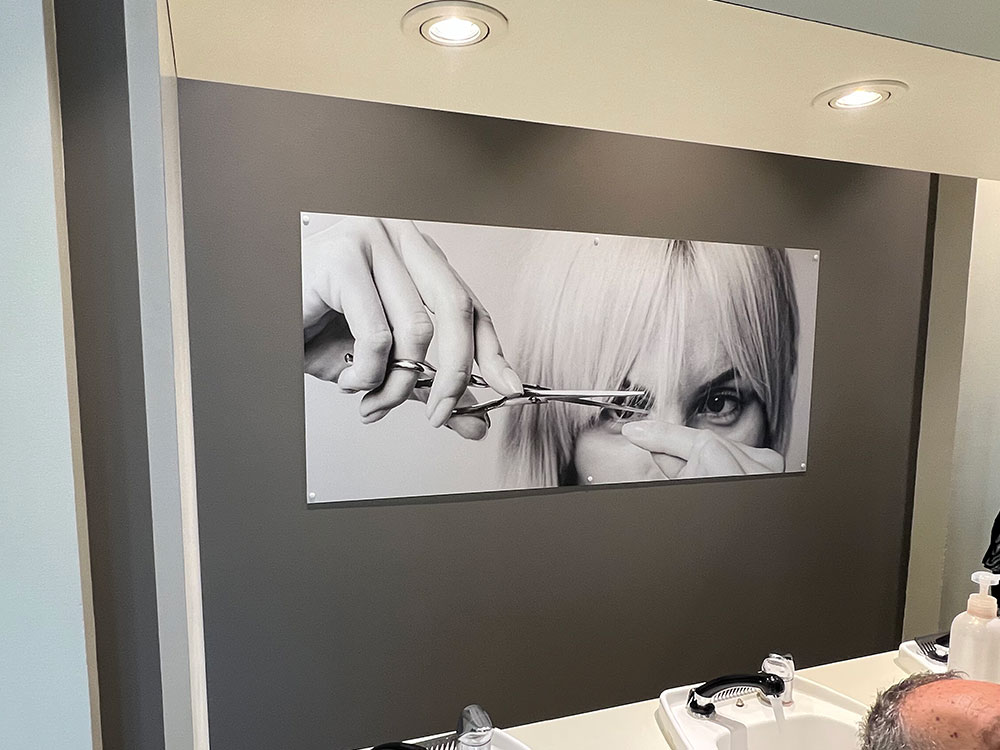 Fourniture de panneaux décoratifs pour un salon de coiffure installé à Annemasse. Décor réalisé par notre partenaire graphique OAK-Webdesign.