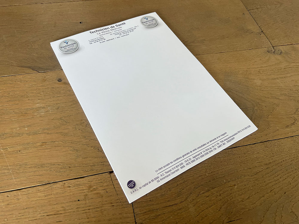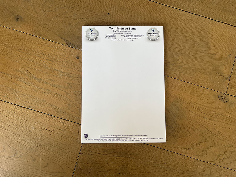 Impression de feuilles à entête pour un magasin paramédical spécialisé en conseil, vente et location d’équipements de santé. Création graphique réalisée par notre partenaire OAK-Webdesign.