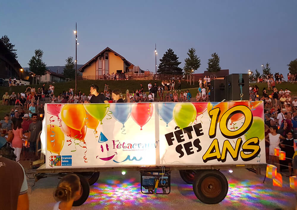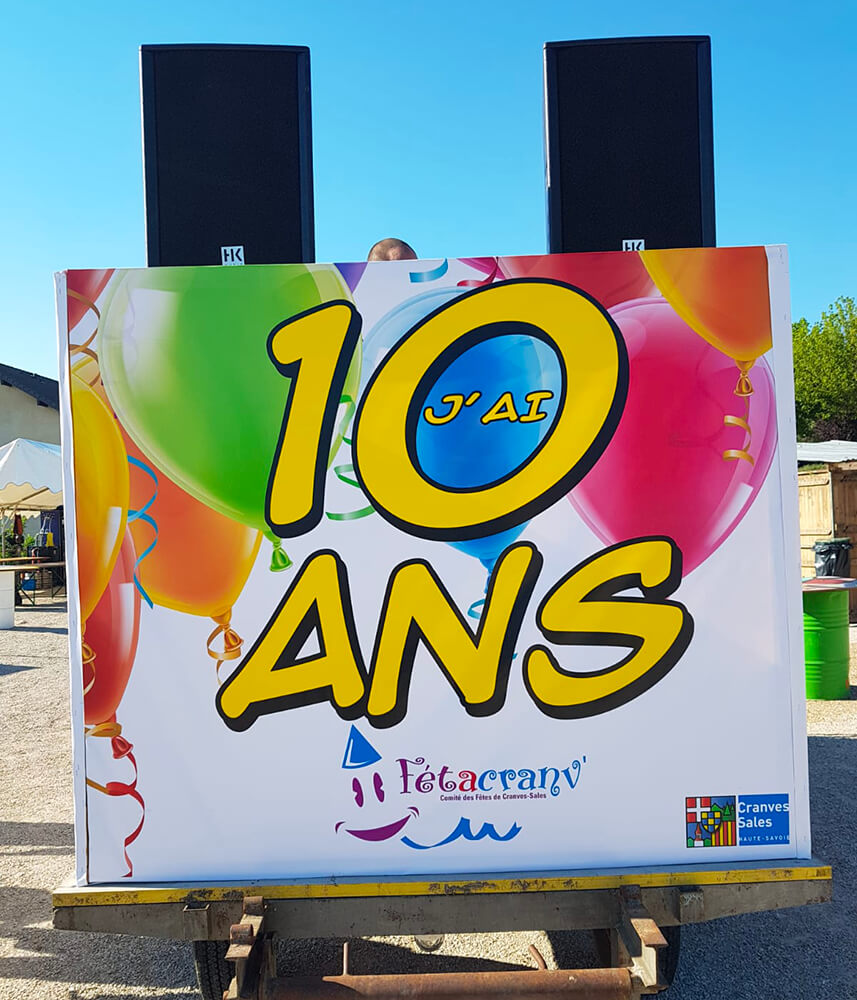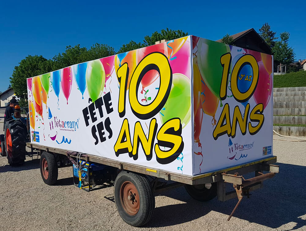 Personnalisation d’un char pour les 10ans de l’association Fétacranv’ de Cranves-Sales. Décor réalisé par nos soins