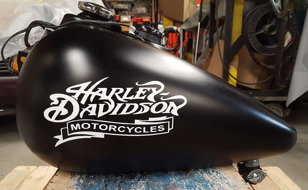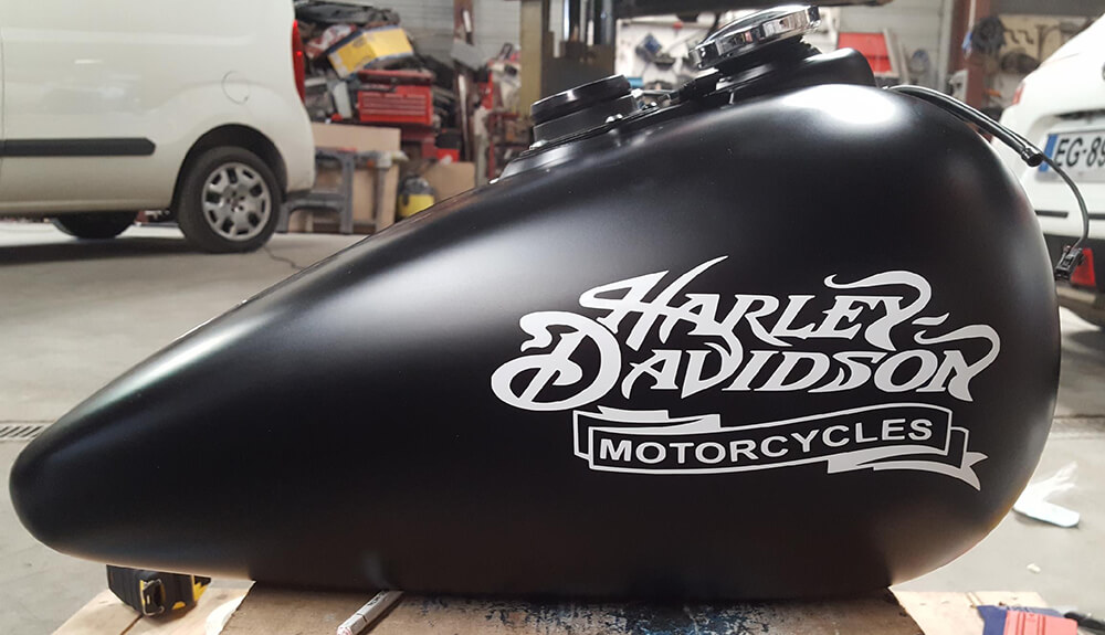 Personnalisation d’un réservoir de moto en décor adhésif teinté masse pour un particulier. Décor réalisé par nos soins.