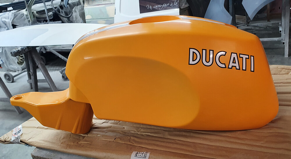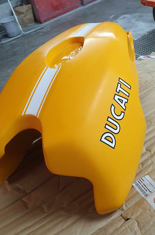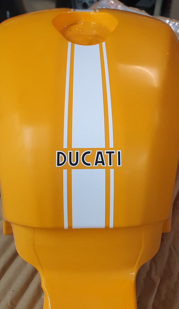 Personnalisation d’un réservoir de moto en décor adhésif teinté masse pour un particulier. Décor réalisé par nos soins.