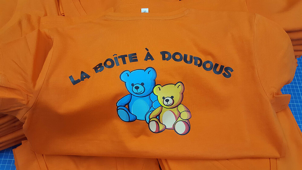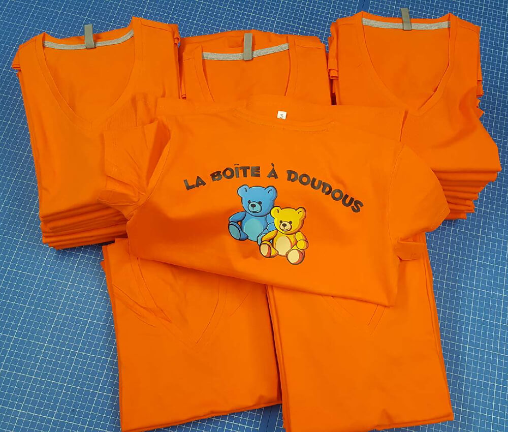 Création de tee-shirt personnalisés pour l’association des assistantes maternelles de Cranves-Sales & Lucinges. Tous nos textiles sont imprimés sur place. Décor réalisé par nos soins.