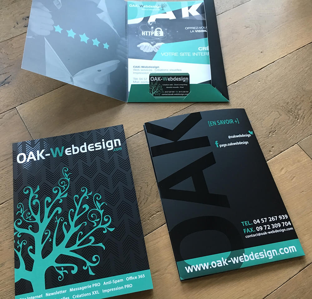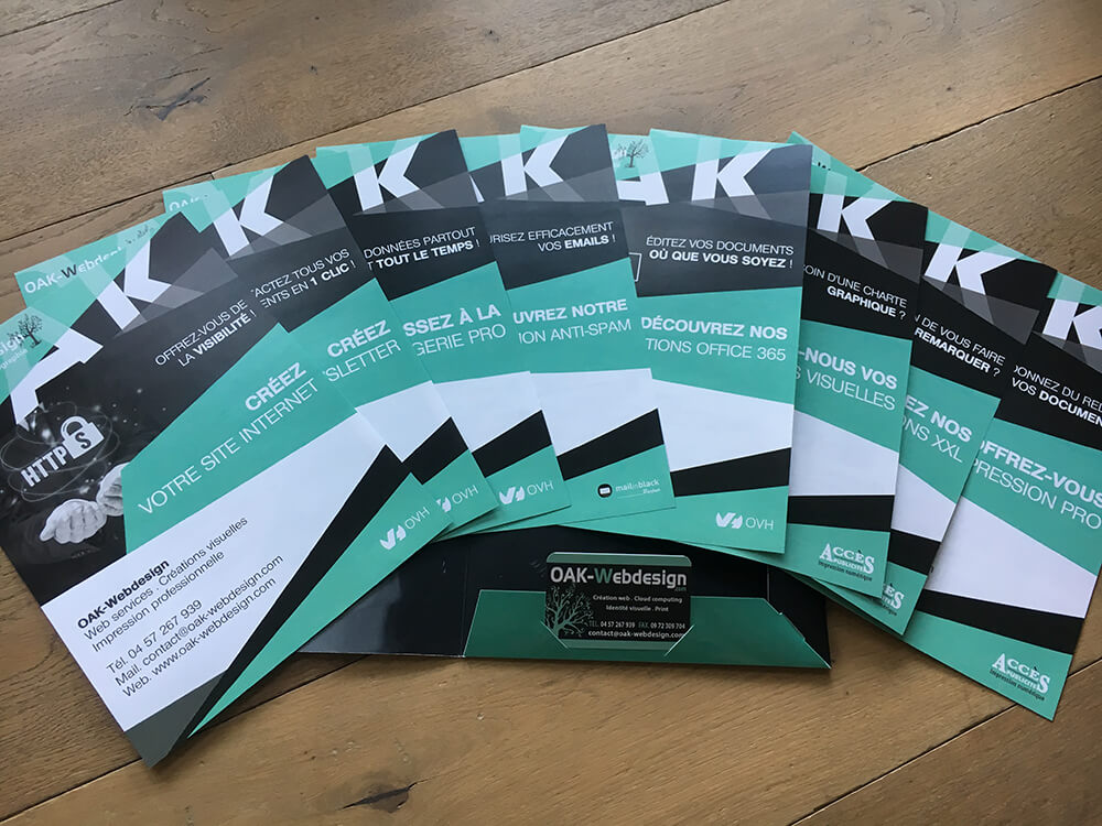 Création des pochettes & flyers publicitaires de notre partenaire graphique. Afin de se démarquer, un vernis sélectif été appliqué sur les principaux éléments de la pochette et nous avons intégré des encoches pour insérer les cartes de visite. Supports de communication imprimés par nos soins.