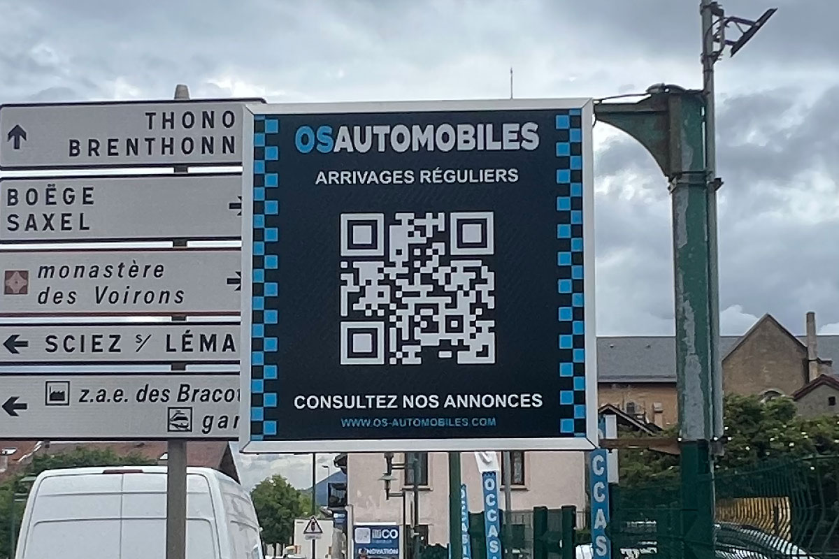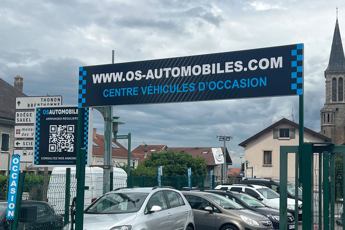 Création et installation de panneaux en Alu Dibond, accompagnée de la mise à jour de l’enseigne lumineuse pour un vendeur de véhicules d’occasion situé à Bons-en-Chablais. La création graphique a été réalisée par notre partenaire OAK-Webdesign.