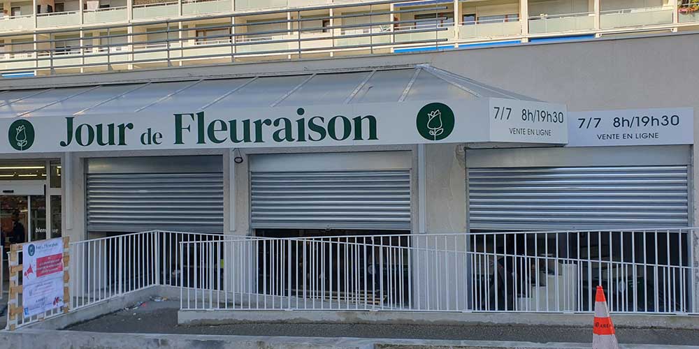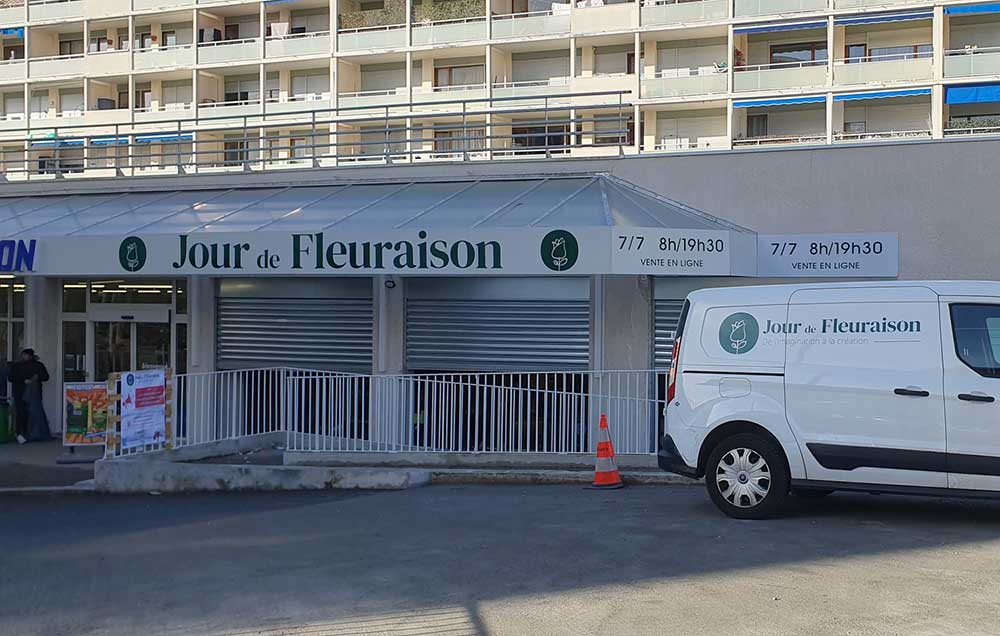 Fabrication et installation de pré-enseignes en Alu Dibond, avec décor adhésif teinté dans la masse, pour le nouveau magasin de ce fleuriste. Les décors ont été réalisés par nos soins.