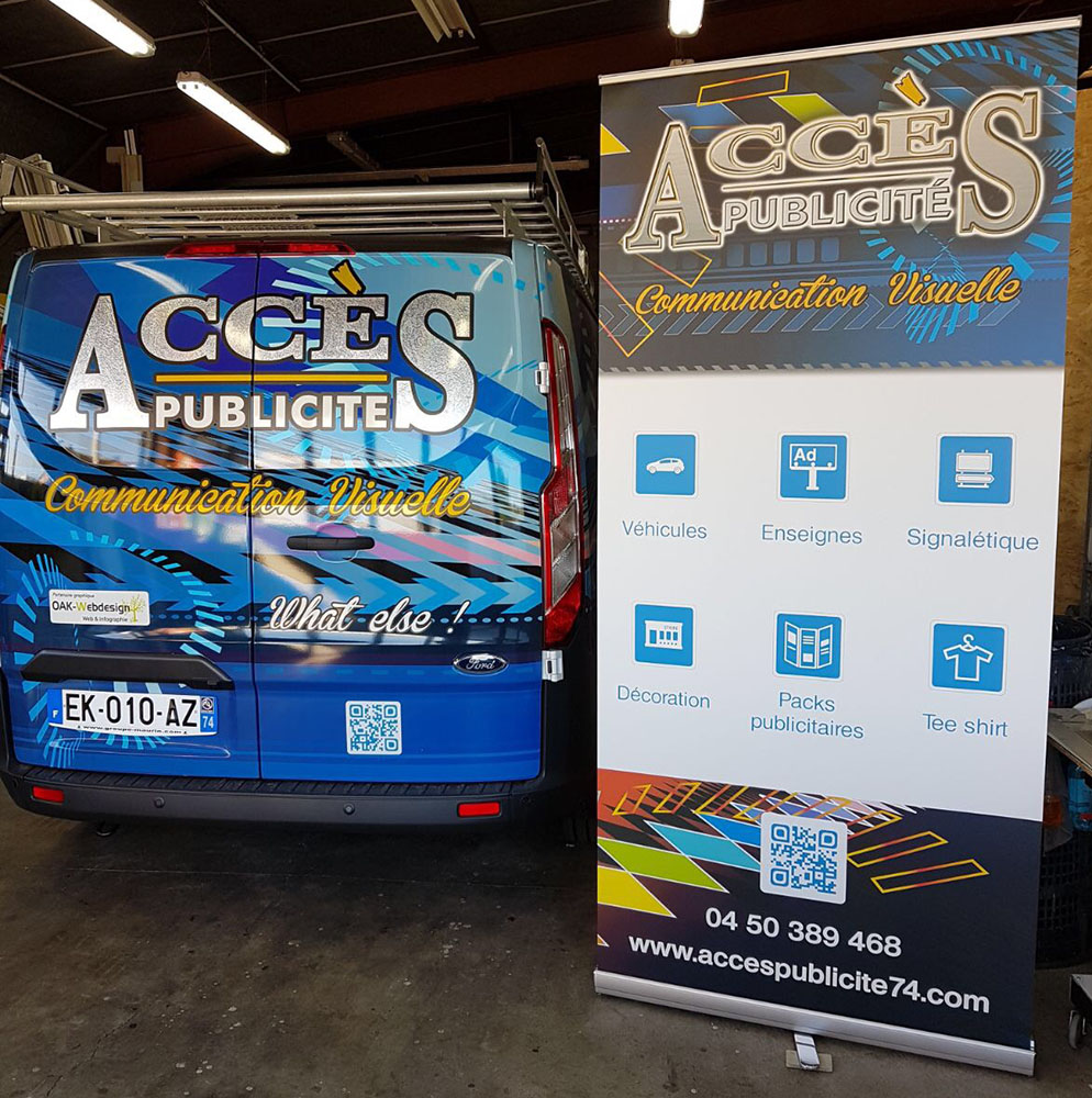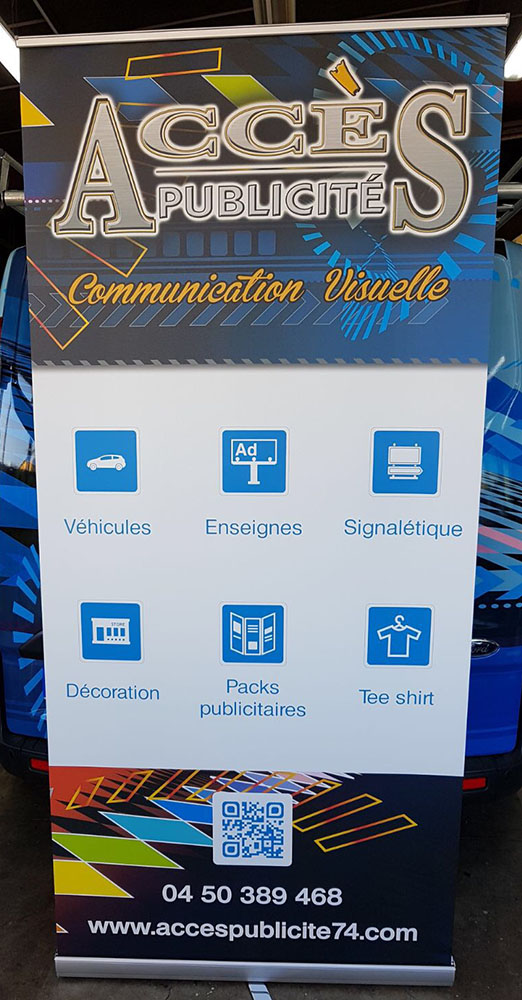 Réalisation d’un Roll’Up permettant de faire la promotion des services que nous proposons. Tous nos Roll’Up sont assemblés et imprimés sur place. Décor réalisé par notre partenaire graphique OAK-Webdesign.