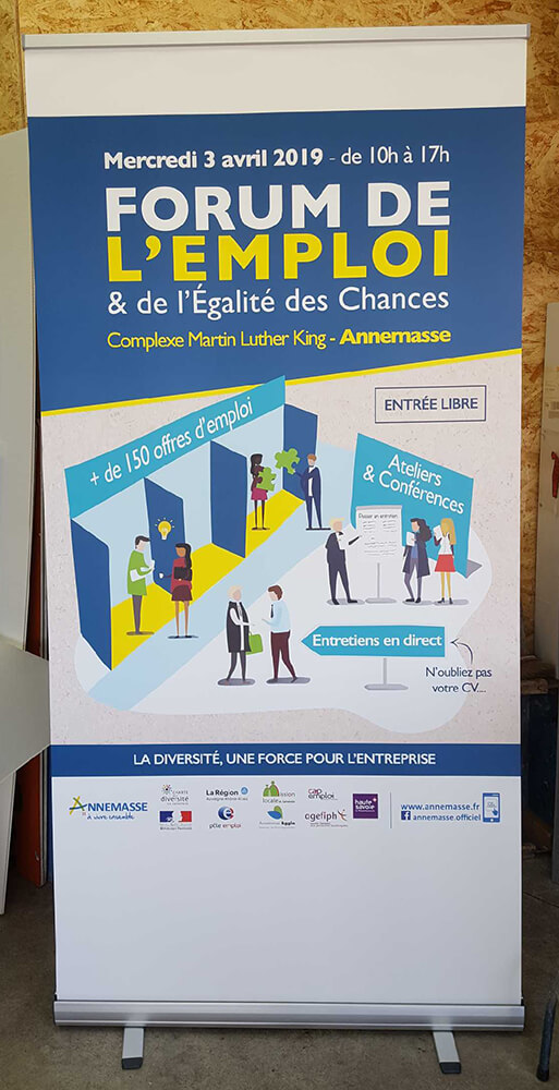 Réalisation de Roll’Up permettant de faire la promotion du forum de l’emploi organisé par la ville d’Annemasse. Tous nos Roll’Up sont assemblés et imprimés sur place.