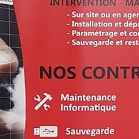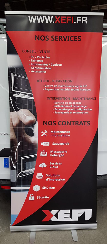 Réalisation d’un Roll’Up permettant de faire la promotion des solutions informatiques offertes par cette société. Tous nos Roll’Up sont assemblés et imprimés sur place. Décor réalisé par nos soins