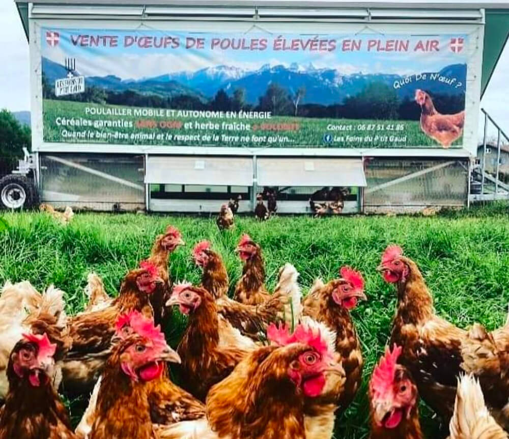 Fourniture d’une bâche en impression numérique destinée à recouvrir le poulailler mobile d’un producteur d’œufs de poules élevées en plein air. Décor réalisé par nos soins.
