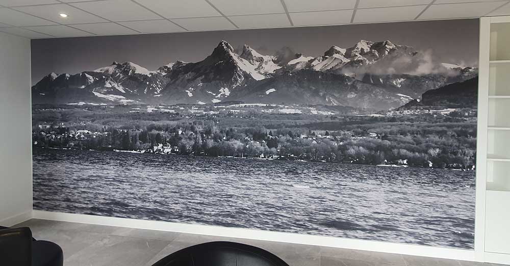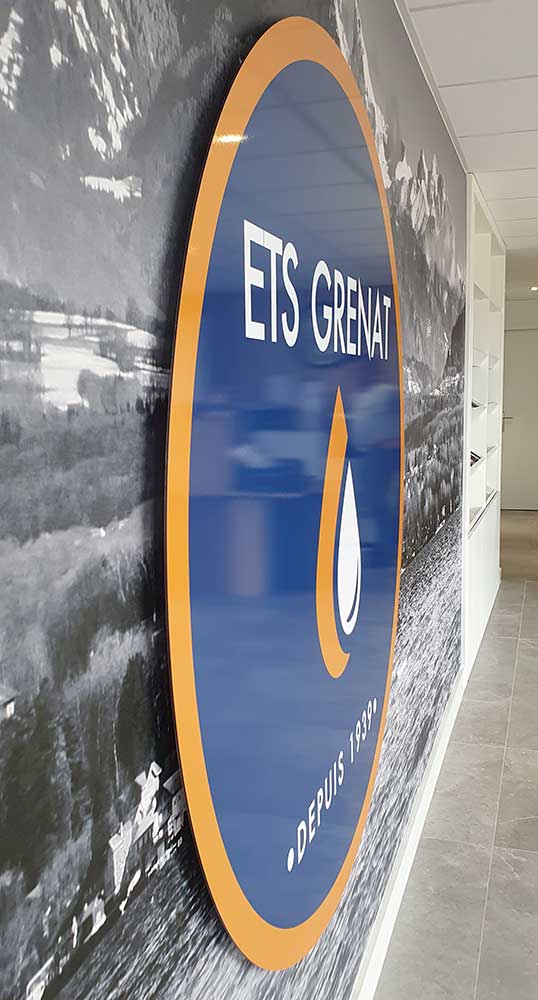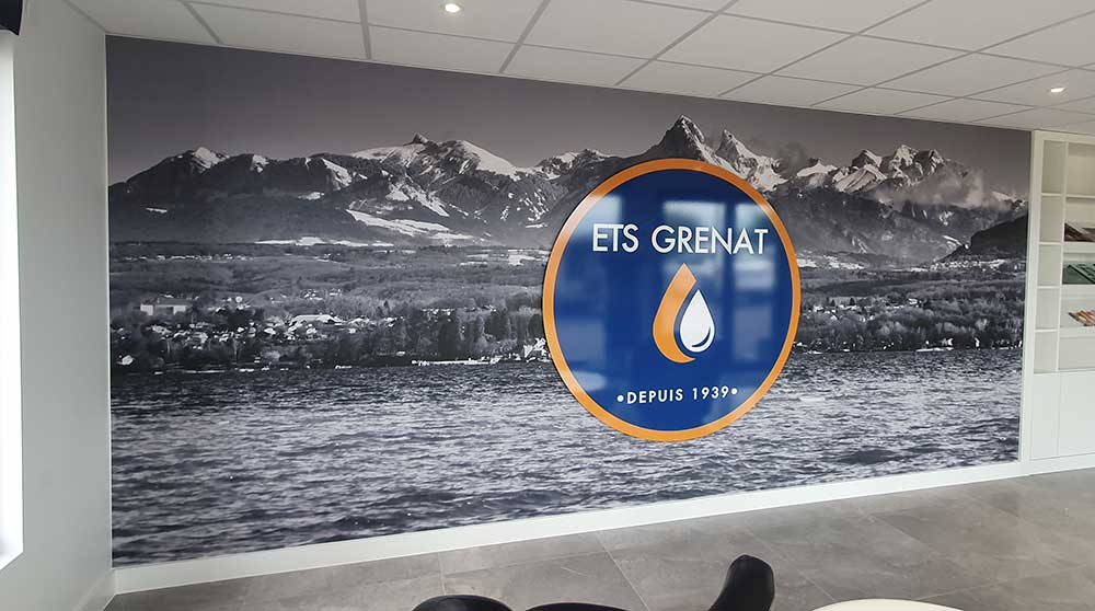 Création & Installation d’enseignes en panneaux Alu dibond et d’un décor en tapisserie murale avec panneau Alu dibond sur entretoises. Décor réalisé en collaboration avec notre partenaire graphique OAK-Webdesign.