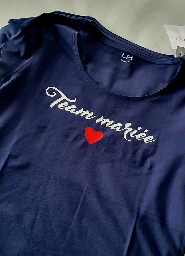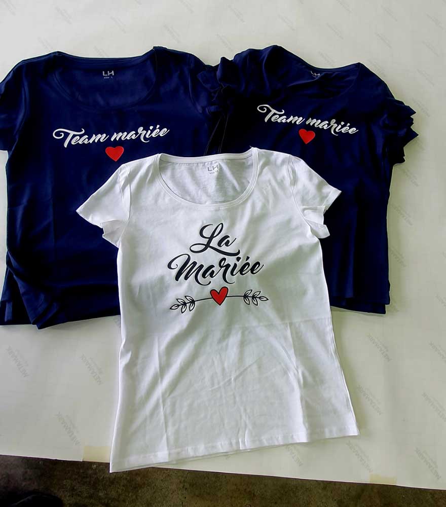 Personnalisation de t-shirts avec marquage par transfert à chaud pour identifier les participants de cet enterrement de vie de jeune fille. Les fichiers graphiques ont été fournis par le client.