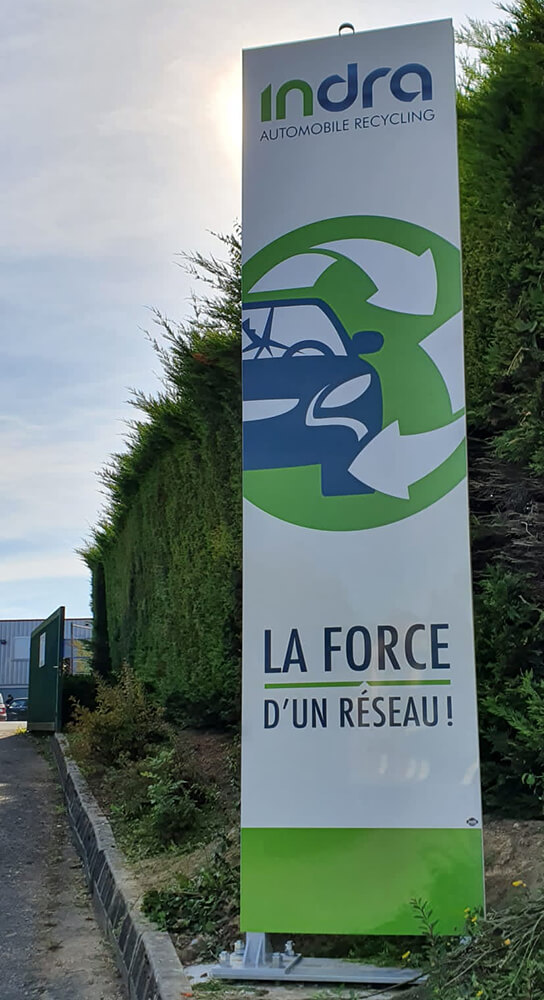 Création d’un Totem avec décor adhésif pour ce fournisseur de pièces automobiles installé à Cranves-Sales. Décor fourni par le client.