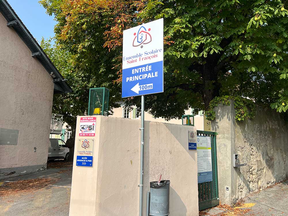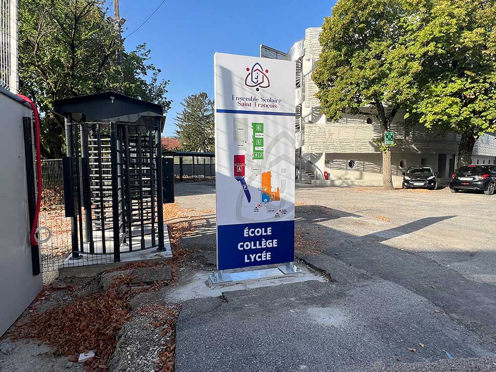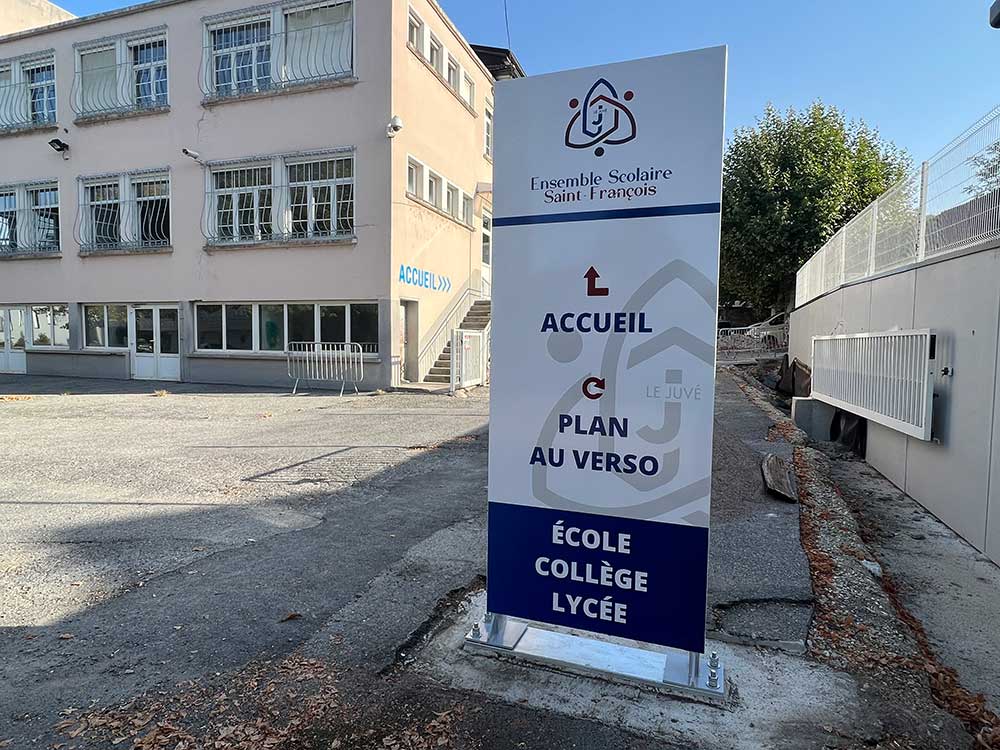 Création & Installation d’un totem, de panneaux d’information et de lettres en Alu dibond afin de parfaire la signalétique de cet ensemble scolaire. Décors réalisés par notre partenaire graphique OAK-Webdesign.